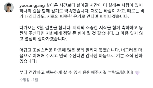 배우 장유상 결혼 축하 메시지와 함께