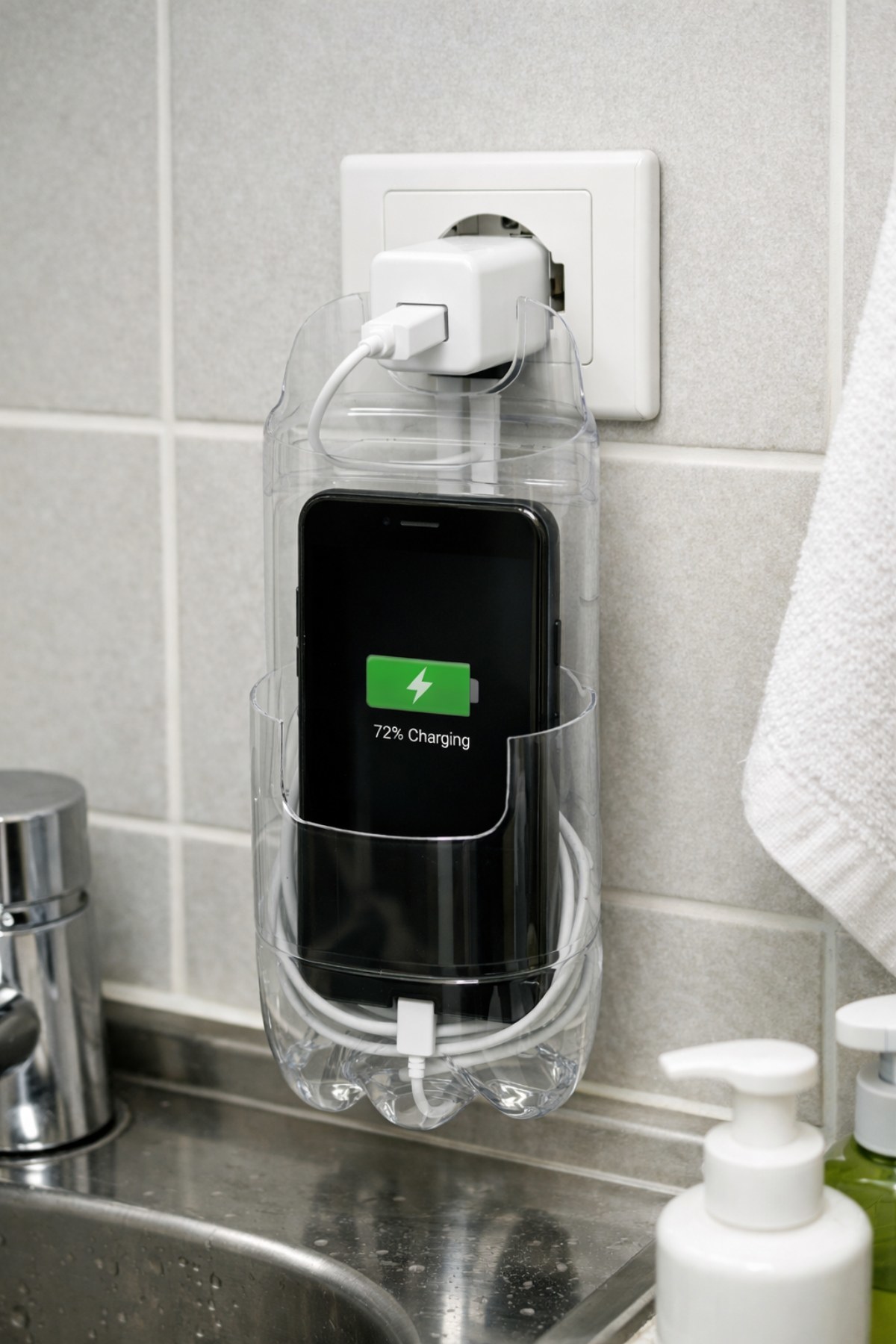 이 방식은 충전 케이블을 페트병 안으로 말아 넣을 수 있어 시각적으로 깔끔할 뿐만 아니라, 반려동물이나 어린아이가 전선을 건드려 발생할 수 있는 감전 및 낙하 사고를 예방하는 데 효과적이다. 특히 주방이나 화장실처럼 바닥에 물기가 있어 기기를 내려놓기 불안한 장소에서 그 활용도가 더욱 빛을 발한다.