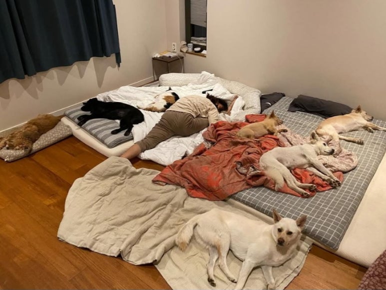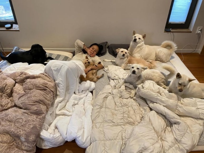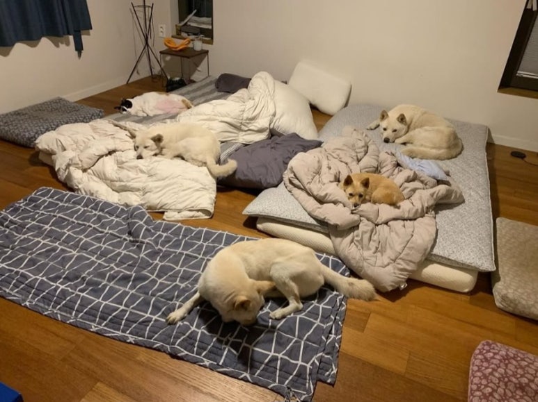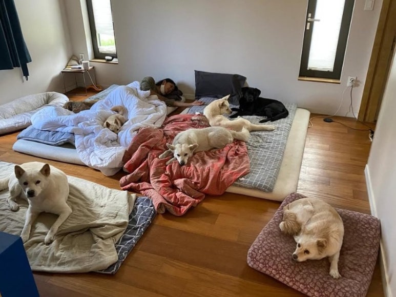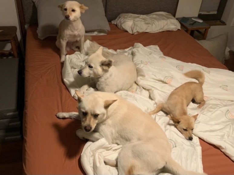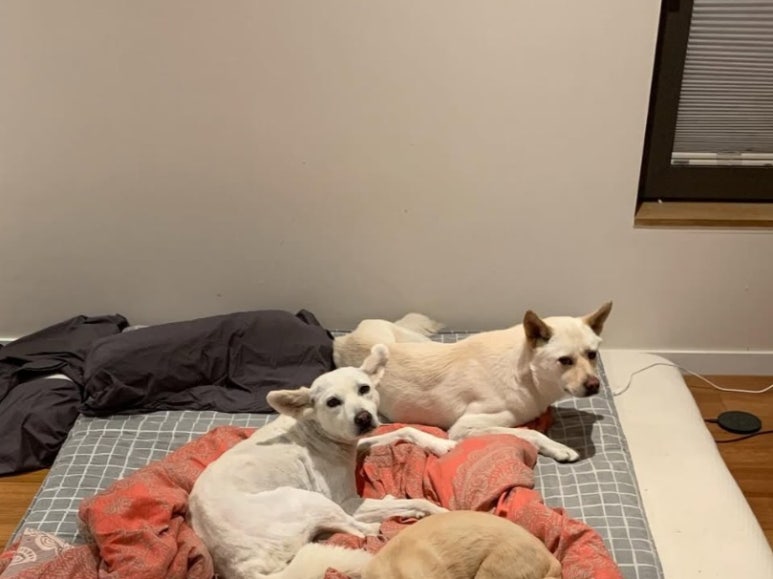 반려견들과 이불 위에 누워 있는