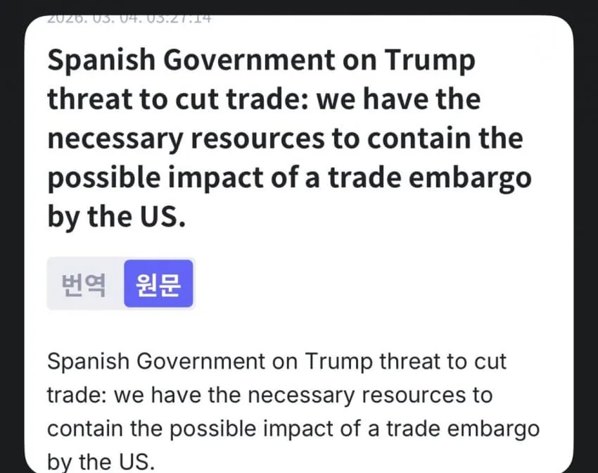 속보: 트럼프 대통령은 스페인이 미군 기지 사용을 금지한다고 발표한 것을 이유로 스페인과의 모든 무역을 중단하라는 지시를 했다고 밝혔습니다. 트럼프 무역 중단 위협에 대한 스페인 정부의 입장 : 우리는 미국의 무역 금지 조치로 인해 발생할 수 있는 영향이 거의 없을 정도의 자원을 보유하고 있음 병원에서 티눈을 세개밖에 못뽑게 된 이유현재 좋아요 19200개 받은 어느 여고생의 개학후 상태꼴값 떠는 60대들 패션 일침논란의(?) 초등학교 문제오늘 새벽에 찍힌 이란 수도 테헤란 상황