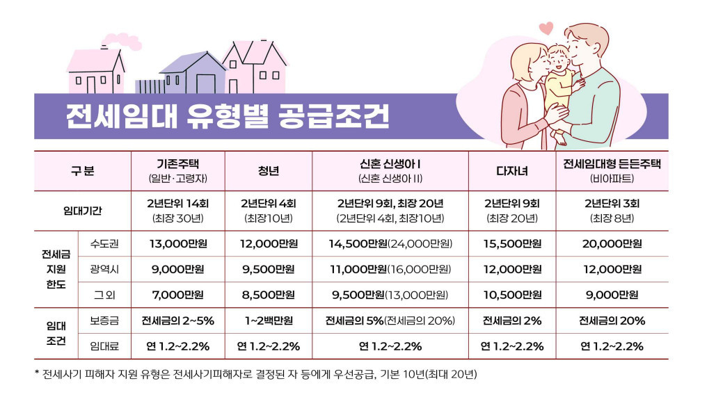 임대 조건 또한 시세보다 저렴하게 책정되어 입주자의 경제적 부담을 최소화했다. 기존 주택 일반 및 고령자 유형은 전세금의 2~5%를 보증금으로 내고 연 1.2~2.2% 수준의 임대료를 지불하게 된다. 임대 기간은 기본 2년이며 일반 유형은 14회까지 재계약이 가능해 최장 30년 동안 안정적으로 거주할 수 있다. 청년 유형은 최장 10년, 다자녀 유형은 최장 20년까지 거주가 가능하다. 전세사기 피해자의 경우 기본 10년에 최대 20년까지 지원을 받을 수 있도록 설계됐다.