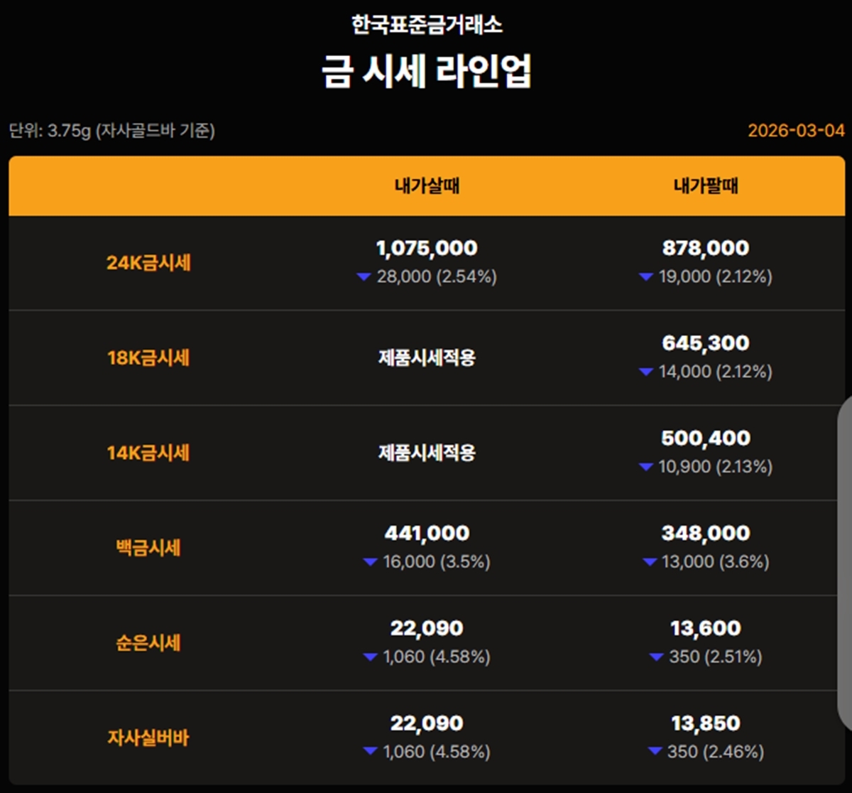 국내 금시세(금값)가 4일(한국 시각) 오후 하락세(전 거래일 대비)를 보이고 있다.