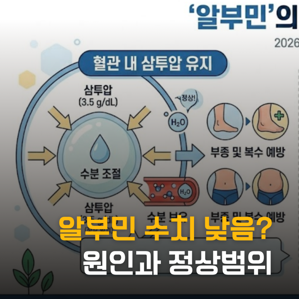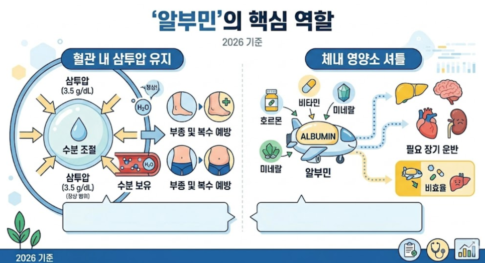 혈관 내 삼투압 유지: 혈액 속의 수분이 혈관 밖으로 빠져나가지 않도록 붙잡아주는 역할을 합니다. 이 힘이 약해지면 손발이 붓는 부종이나 배에 물이 차는 복수가 생길 수 있습니다.