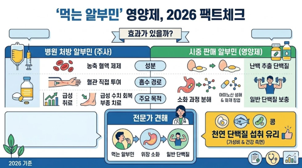 주의가 필요합니다. 시중 알부민 영양제 상당수가 계란 흰자 추출물을 사용하므로, 알레르기가 있다면 식물성 단백질이나 육류를 통해 보충하는 것이 안전합니다.