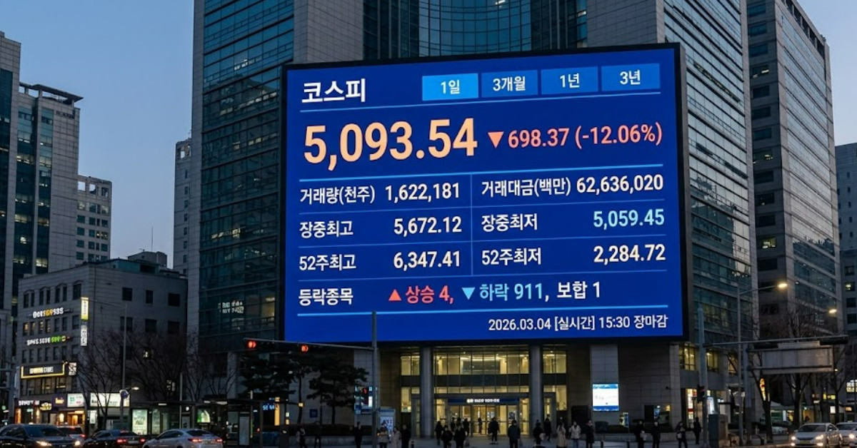 4일 코스피는 전 거래일보다 698.37포인트 내린 5093.54로 장을 마쳤다. 하락률은 12.06%에 달한다. 장중 한때 5059.45까지 추락하며 52주 최고치인 6347.41 대비 크게 위축된 흐름을 보였다. 이날 거래량은 16억 2218만 1000주였으며 거래대금은 62조 6360억 2000만 원으로 집계됐다.