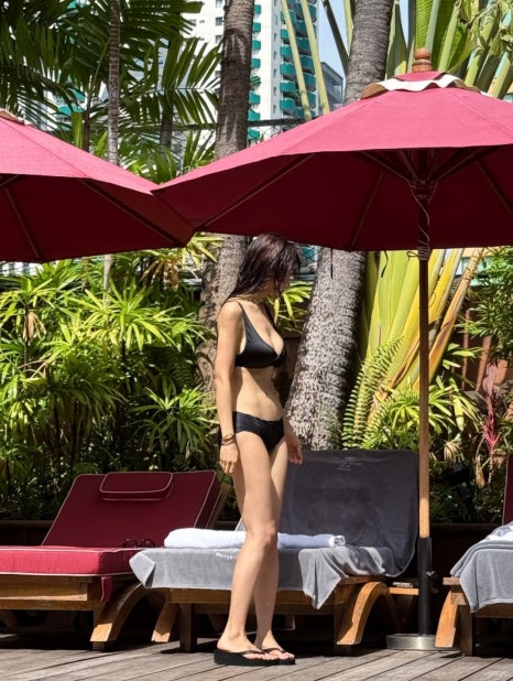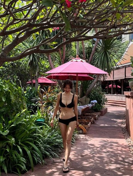 태국 리조트의 붉은 파라솔과 푸른 식물들 사이에서 걷는 그녀의 모습은 마치 한 편의 화보 같습니다. 블랙 비키니와 대조되는 붉은 꽃, 그리고 내추럴하게 묶은 헤어스타일까지 모든 디테일이 완벽한 리조트룩의 표본을 보여주네요.