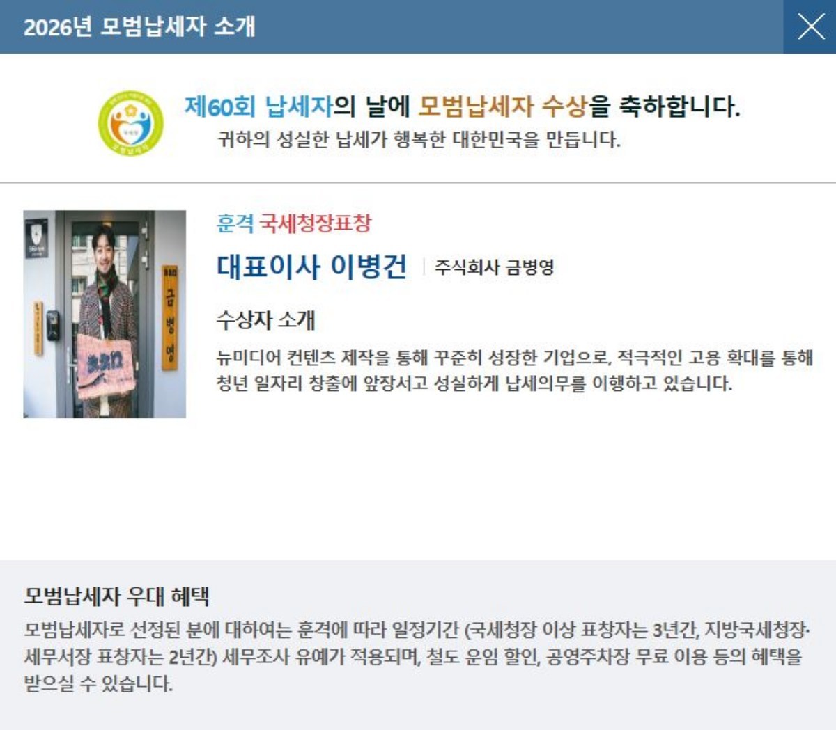 잠실세무서는 제60회 납세자의 날을 맞아 모범납세자 수상자 명단을 발표했으며, 이 가운데 주식회사 금병영 대표이사 이병건이 포함돼 국세청장 표창을 받았다.