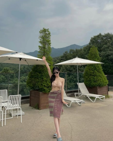 누드톤 비키니 + 리본 디테일 + 블랙 선글라스 + S라인 + 마운틴 뷰 = 럭셔리 풀캉스 완성이에요.