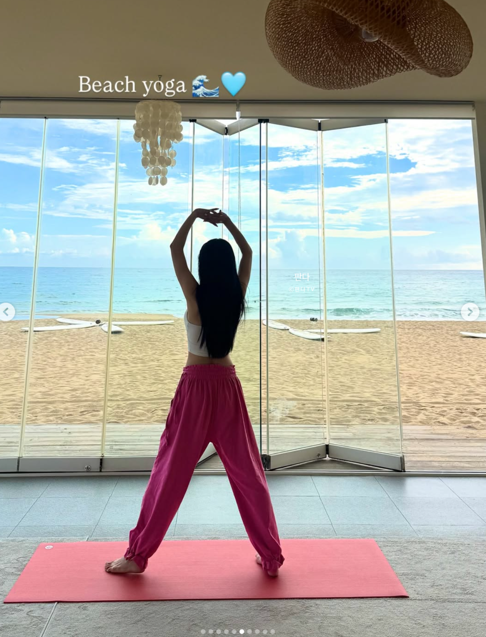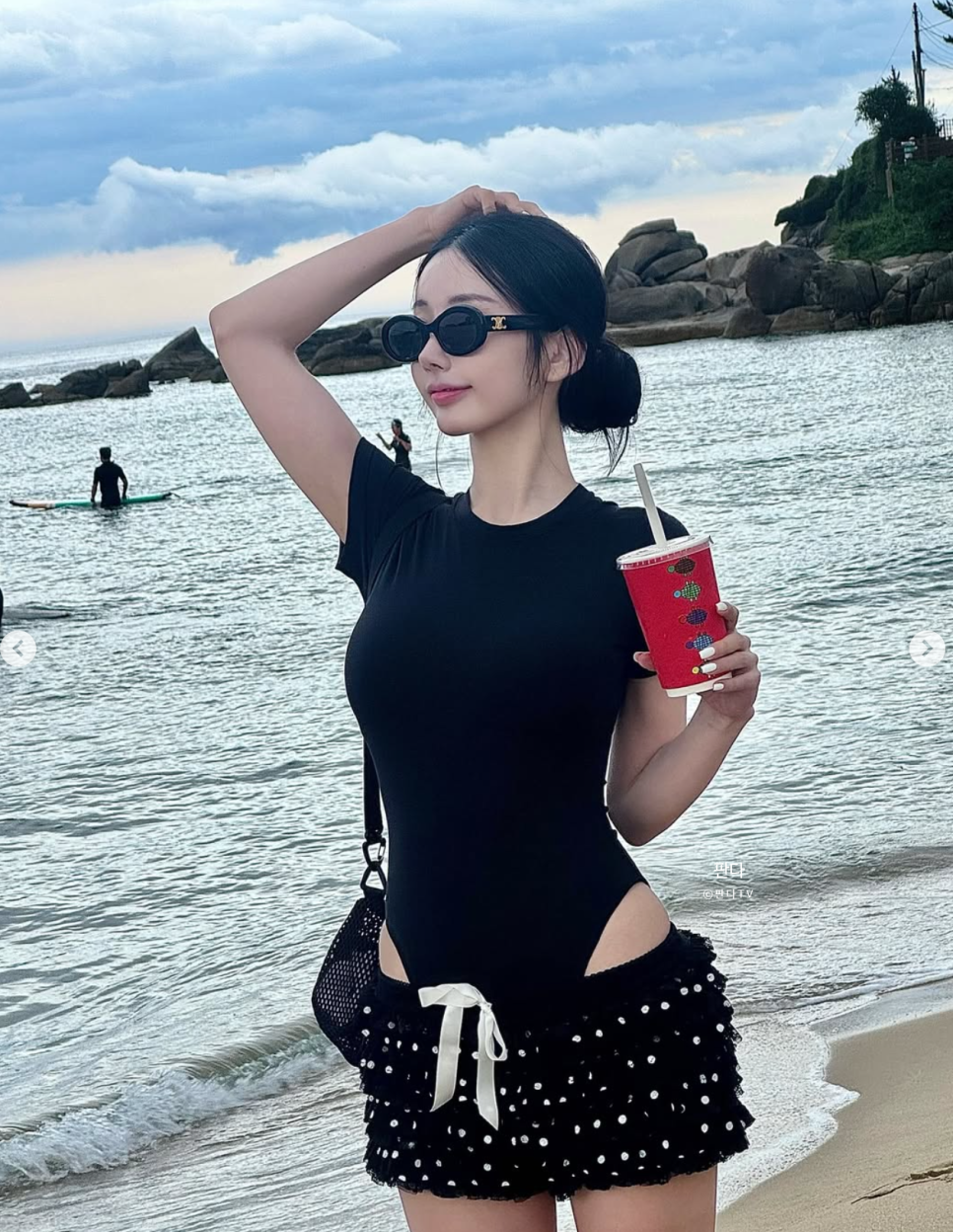 단순한 수영복을 넘어 휴양지 배경과 완벽하게 어우러지는 영리한 선택이 사진 속 존재감을 더욱 선명하게 살려주었습니다.