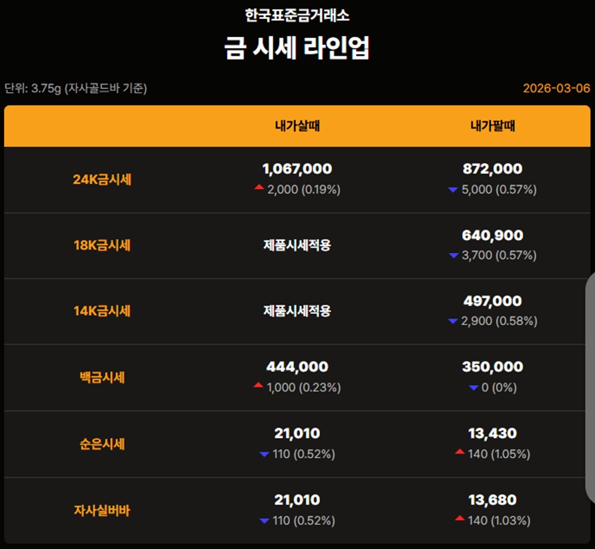 대한민국 자본시장을 종합적으로 관장하는 한국거래소 기준 이날 오후 금가격은 다음과 같다.