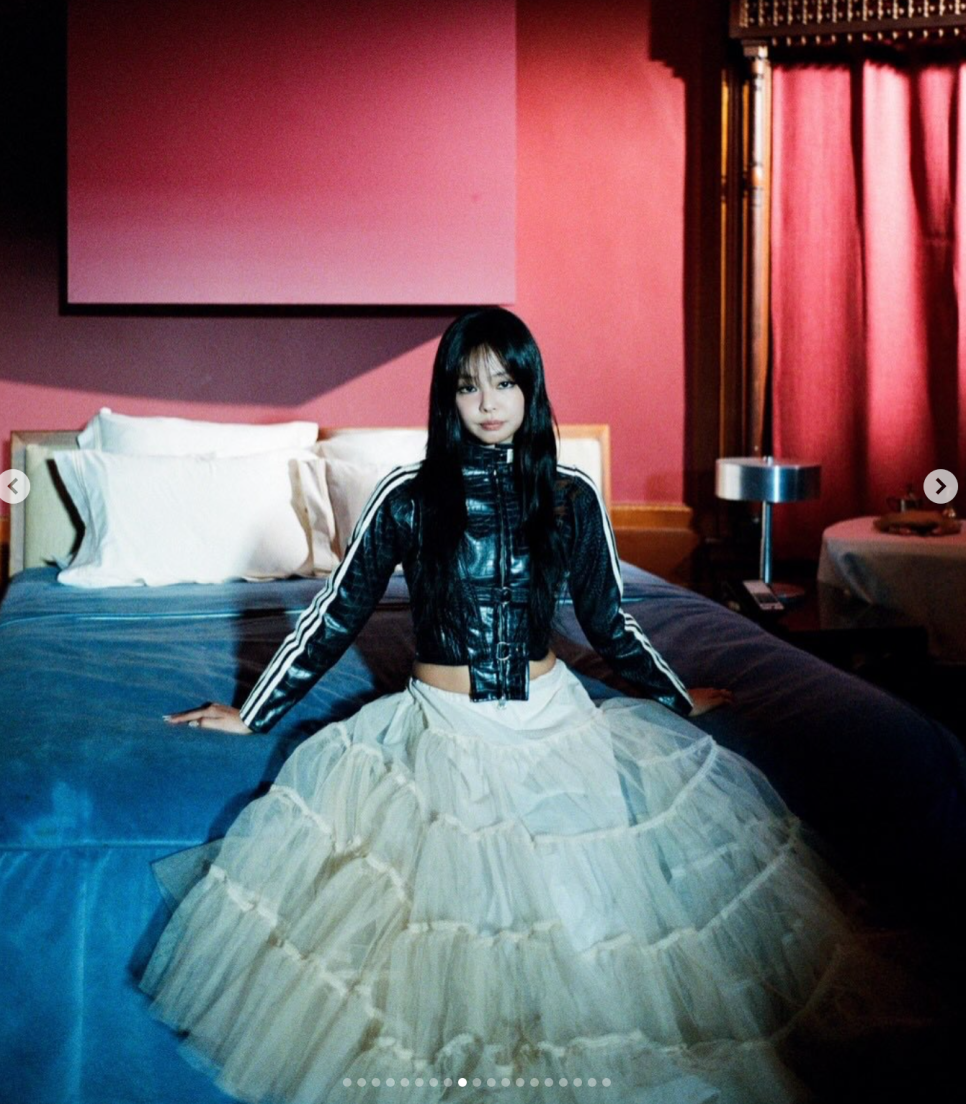 이번 화보에서 제니는 기존의 삼바 대신 아디다스 슈퍼스타 2를 착용하며 완벽한 레트로 무드를 보여줬어요.
