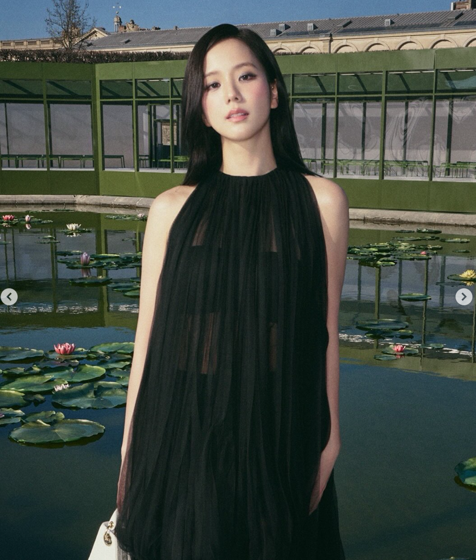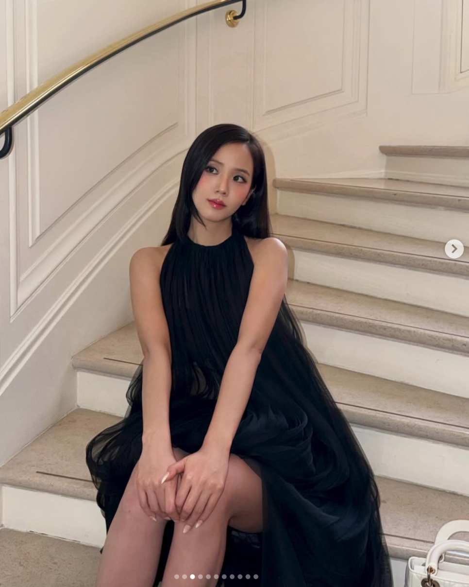 이번에 가장 눈에 띄었던 건 착장의 변화였어요. 평소 단정하고 클래식한 룩을 즐겨 입던 지수 님이 이번엔 겹겹이 쌓인 블랙 튤 소재의 시스루 드레스를 선택했거든요.