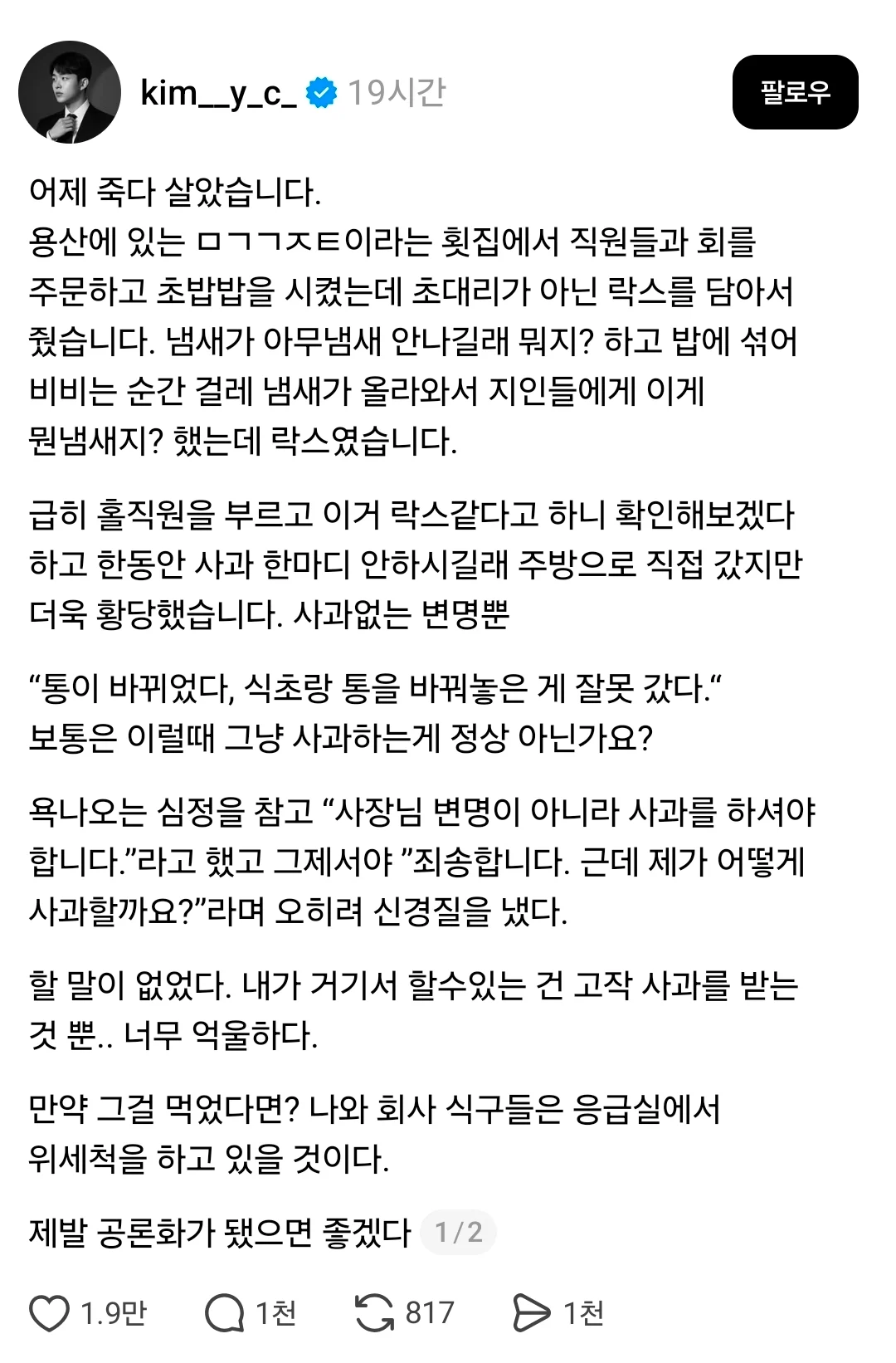 일단 지금 뉴스 떳고 사건반장 제보하고 위생과랑 식약처 다 신고했다고 함 롯데가 이기면 저녁먹고 아님 굶는다는 사람 결말제주도 바가지 김밥, 순대 근황휘발유 품절사태 발생친구 차 탔는데 이런 안내문 받았다는 사람은근 많다는 인간군상