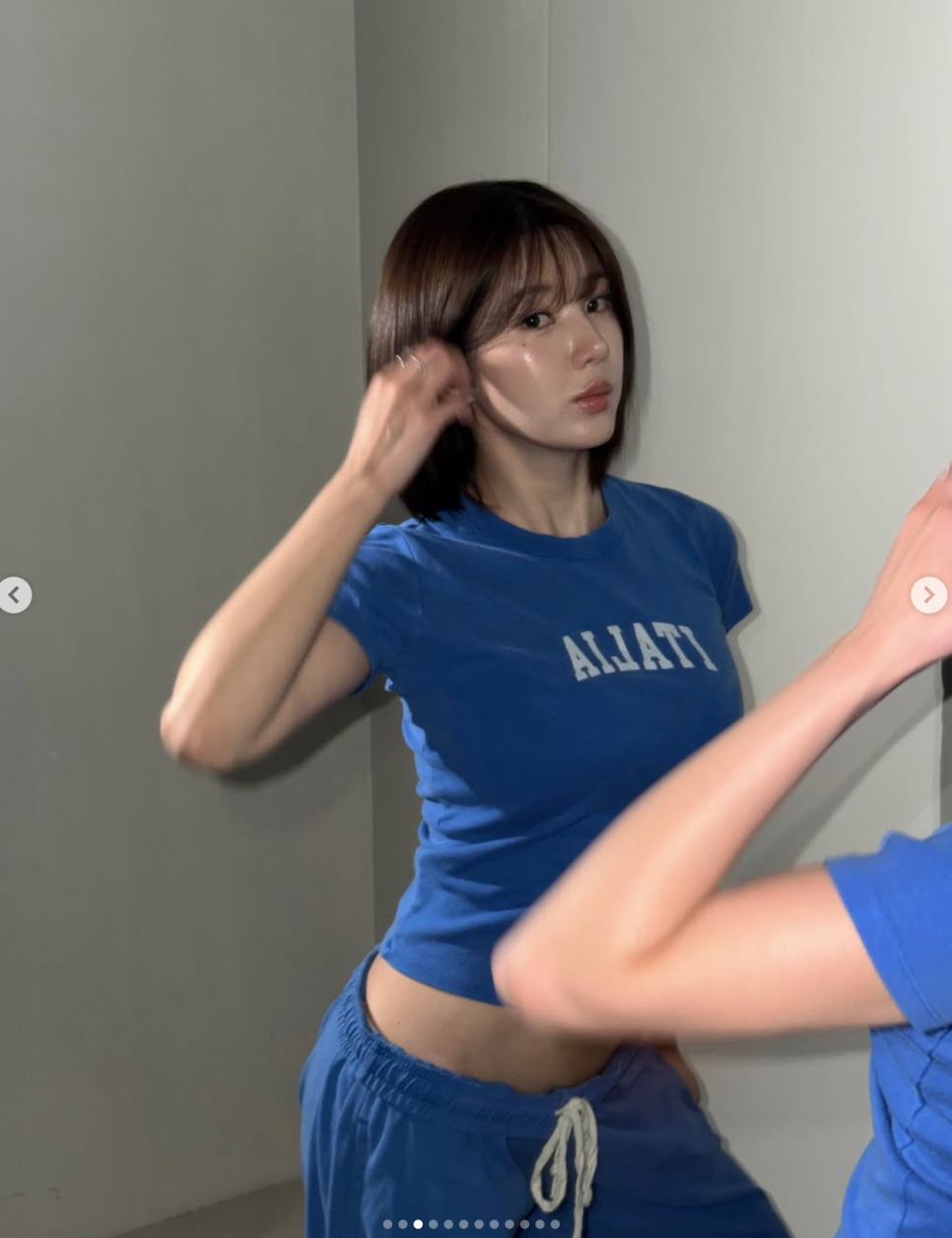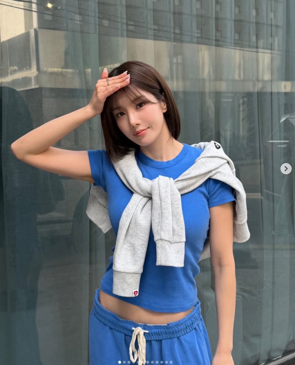 이번에 특히 난리 난 건 권은비님의 블루 크롭티 코디예요. 선명한 블루 톤 티셔츠에 트레이닝 팬츠를 매치했는데, 짧은 기장 사이로 드러난 복근 라인이랑 한 줌 허리가 눈길을 팍 끌더라구요.