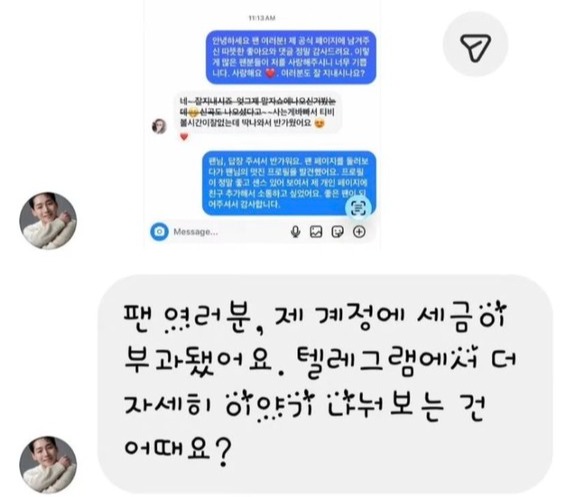 7일 박군은 온라인 채널을 통해 “다들 조심하세요”라는 글과 함께, 사칭 계정이 팬들과 주고받은 메시지 내용을 공개했다.