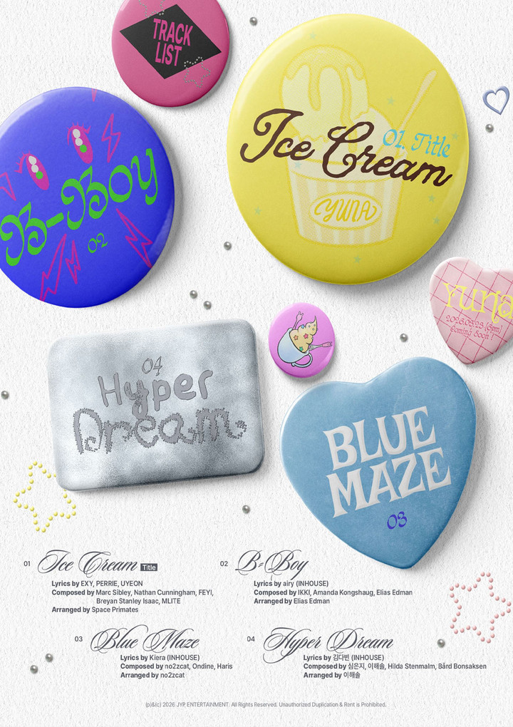 공개된 트랙리스트에 따르면 ‘아이스크림’에는 동명의 타이틀곡을 비롯해 ‘비보이(B-Boy)’, ‘블루 메이즈(Blue Maze)’, ‘하이퍼 드림(Hyper Dream)’ 등 총 4곡이 담길 예정이다. 핀 배지 디자인이 앨범 분위기를 한층 밝게 하면서 유나가 선보일 새로운 음악 스타일에 기대가 쏠리고 있다.