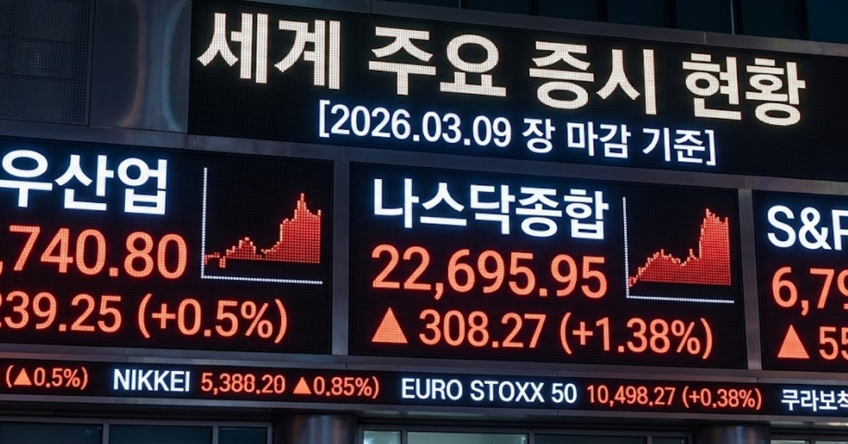 9일 (현지 시각) 뉴욕증권거래소에서 다우 47740.80 기록하며 0.5% 상승했다. 나스닥 종합 22695.95 마감하며 1.38% 급등했고 S&P 500 역시 6795.99 장을 마치며 0.83% 올랐다. 장 초반 중동발 공급 우려에 서부텍사스산원유(WTI) 가격이 배럴당 120달러선까지 치솟으며 증시를 압박했으나 오후 들어 분위기가 반전됐다.