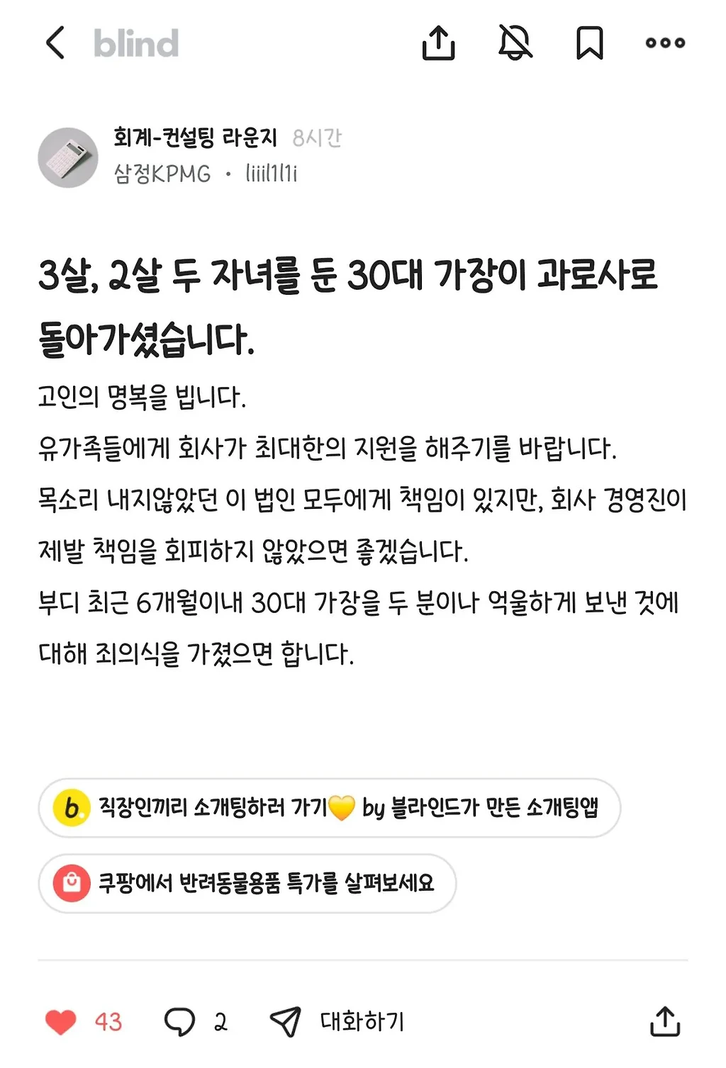 최근 6개월동안 30대 가장 2분이 과로사로 돌아가셨다고 블라인드에 난리남 회계사 엄청 바쁘다고 들었지만 이거는 너무 심한거같네 삼가 고인의 명복을 빕니다. '퇴사하고 싶다' 혼잣말 때문에 퇴사당하게 생긴 직원수업 참여도가 높은 학생늦둥이 여동생 가지면생기는일징역 42년 받고 깜빵 생활중인 N번방 조주빈 최근 소식국밥집에서 중요도가 떨어지는 것