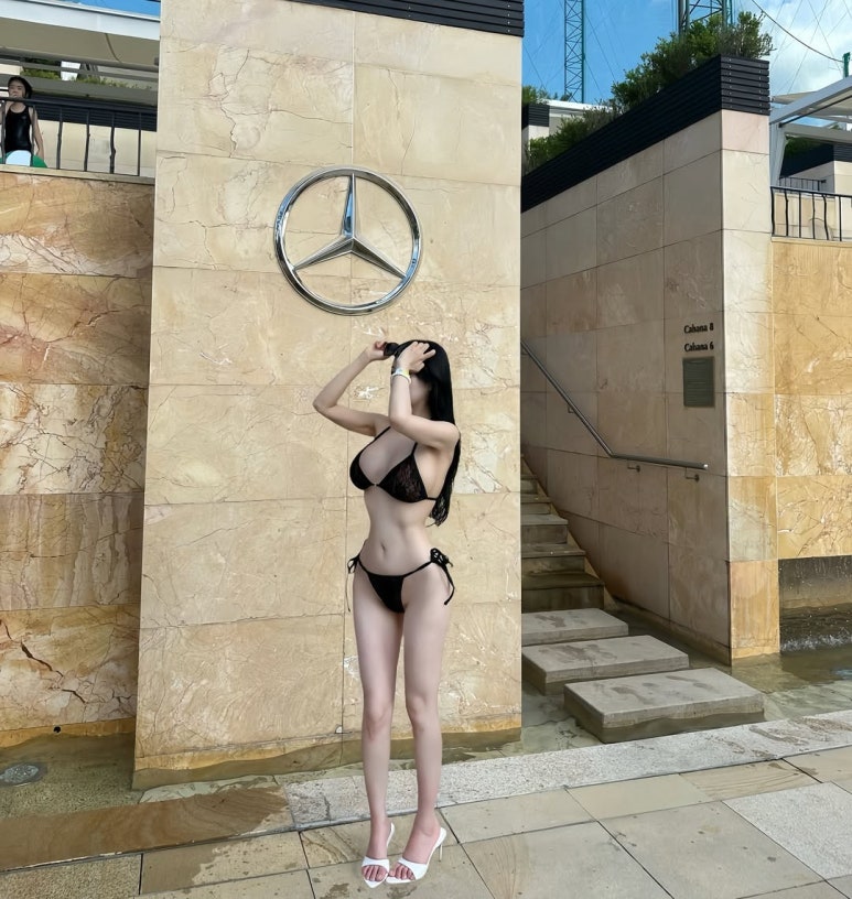 패션 포인트: 정교한 레이스 디테일의 블랙 비키니로 고급스러운 섹시미를 자아냈습니다. 여기서 주목할 점은 바로 화이트 하이힐 뮬과의 믹스매치! 다리를 훨씬 길어 보이게 만드는 '필승 전략'이죠. 👠👆