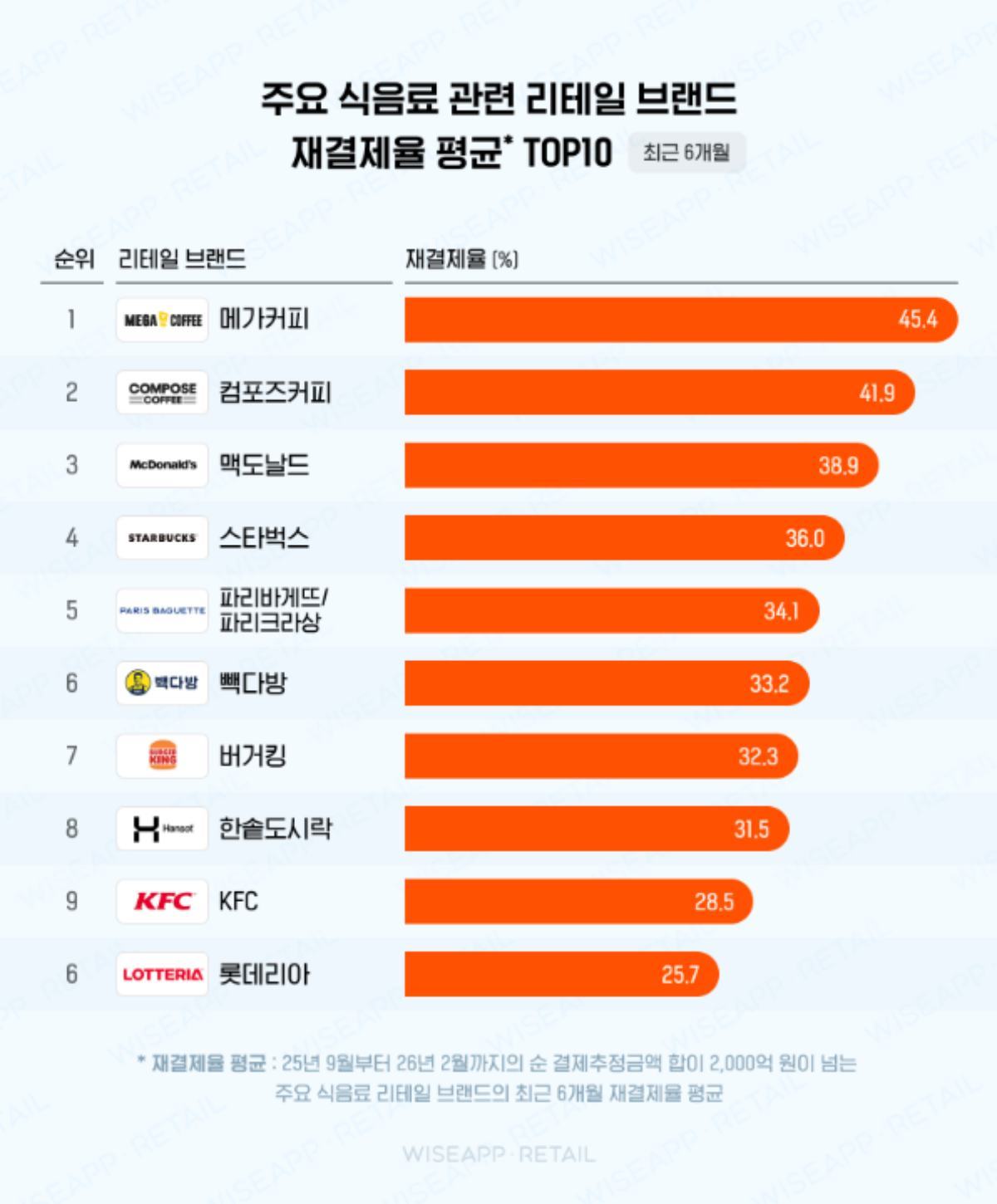 고객이 얼마나 다시 매장을 찾는지 보여주는 재결제율에서도 메가커피가 1위를 차지했다. 최근 6개월 동안 메가커피의 평균 재결제율은 45.4퍼센트로, 고객 두 명 중 한 명꼴로 다시 메가커피를 이용했다.