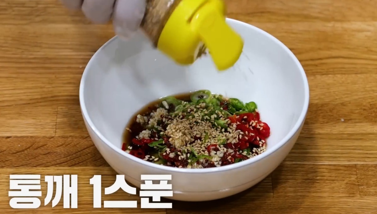 용기에 설탕 반 스푼, 고춧가루 반 스푼을 넣는다. 순두부 양념장에는 고춧가루를 많이 넣지 않는 것이 좋다. 다진 마늘을 많이 넣으면 깔끔한 맛이 덜해지므로 적당하게 넣는 것이 좋다. 다음으로 진간장 세 스푼과 물 두 스푼을 넣는다. 마지막으로 참기름 한 스푼과 통깨 한 스푼을 넣은 후 앞서 썰어뒀던 대파와 청양고추, 홍고추를 넣으면 완성이다.