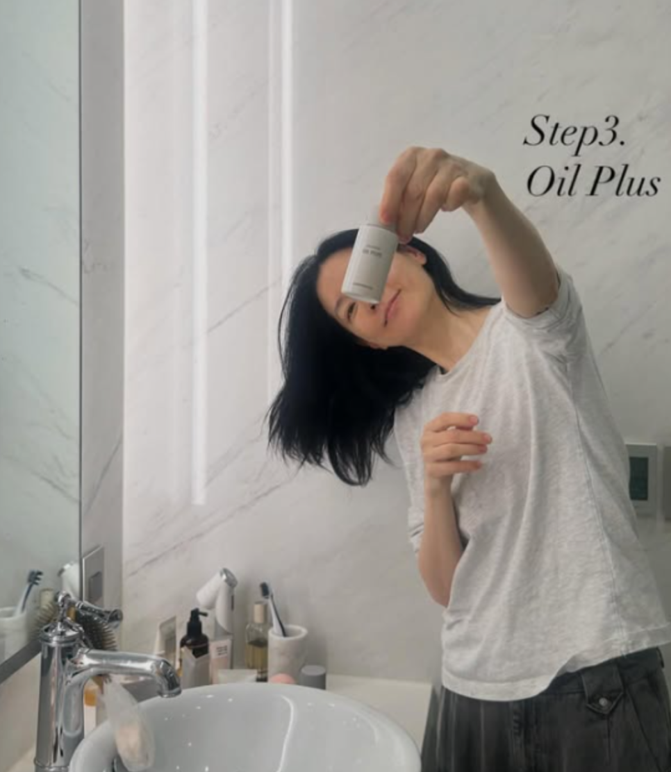 그녀의 피부 관리 철학은 '덜어냄'에 있어요. 아침에는 폼클렌징 대신 미지근한 물로 가볍게 세안하고 찬물로 마무리하는 정도죠.