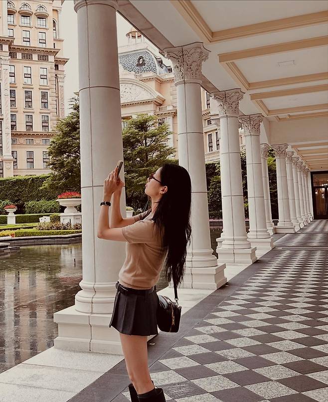 고풍스러운 유럽풍 건축물을 배경으로 서 있는 서현은 베이지 톤의 반팔 니트와 짙은 그레이 컬러의 플랩 테니스 스커트를 매치해 클래식하면서도 세련된 프레피 룩을 선보이고 있어요.
