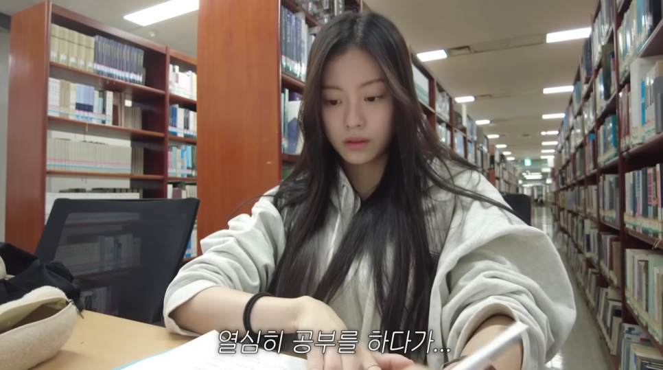 도서관에서 전공 서적과 씨름하고