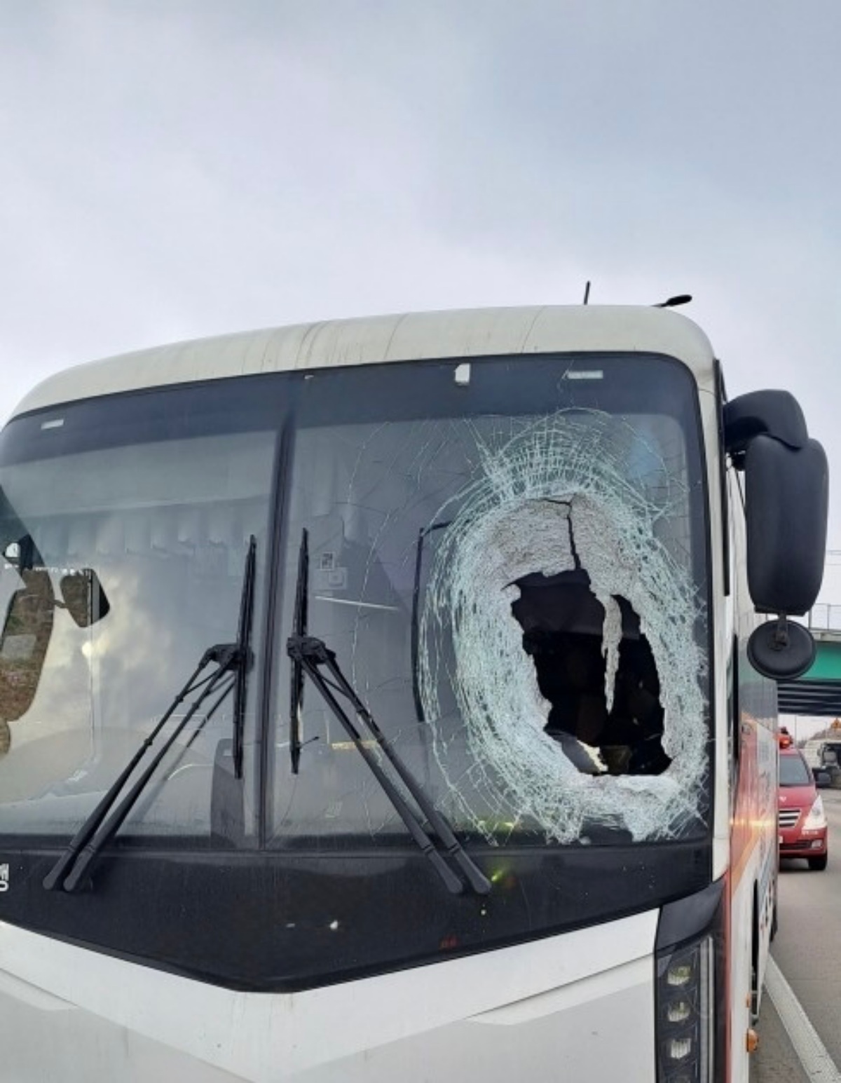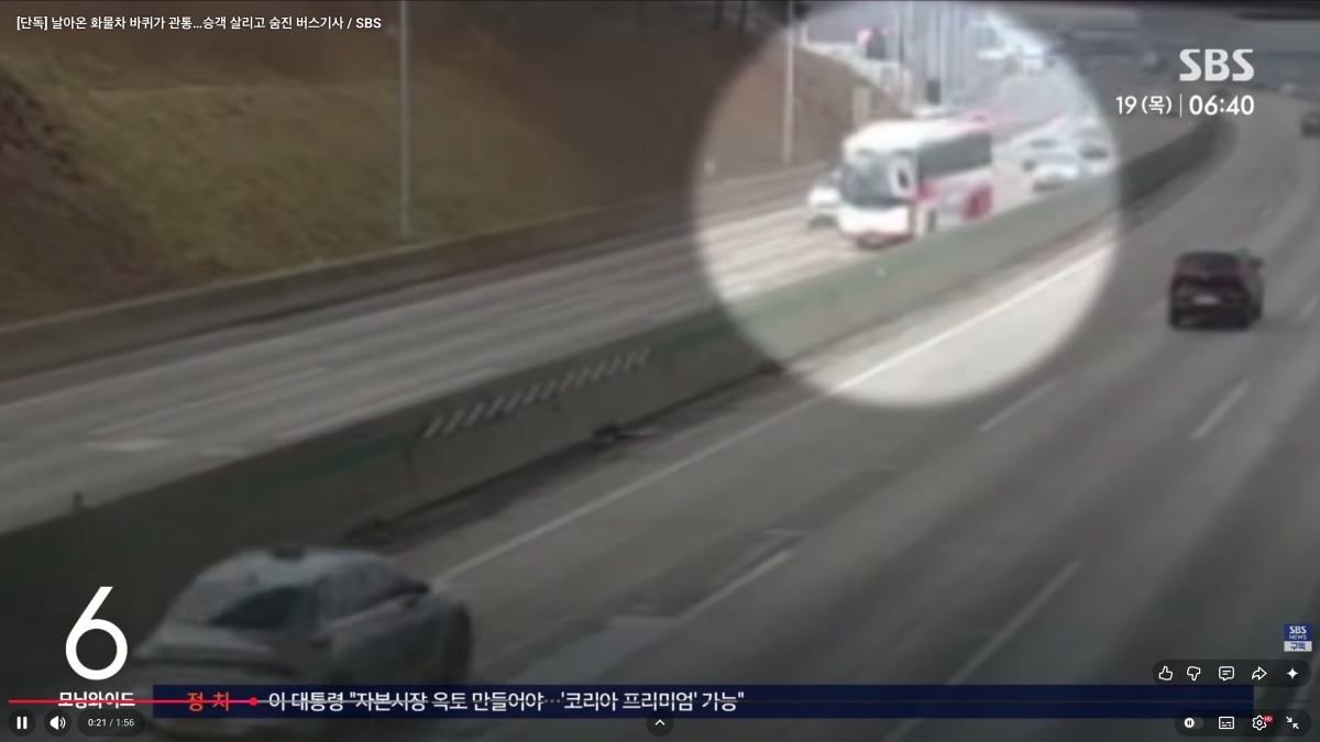 보도에 따르면 서해안 고속도로 금천 방향으로 달리던 화물차에서 바퀴 하나가 갑자기 빠졌고 이 바퀴는 중앙분리대를 넘어 반대편 무안 방향 차로로 날아갔다. 이어 반대편에서 주행 중이던 시외버스 운전석 쪽을 그대로 덮쳤다. 갑작스러운 충격으로 운전기사 A 씨가 크게 다쳤고 버스 앞유리도 크게 파손됐다.