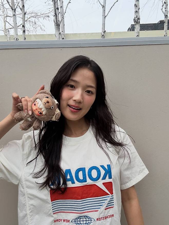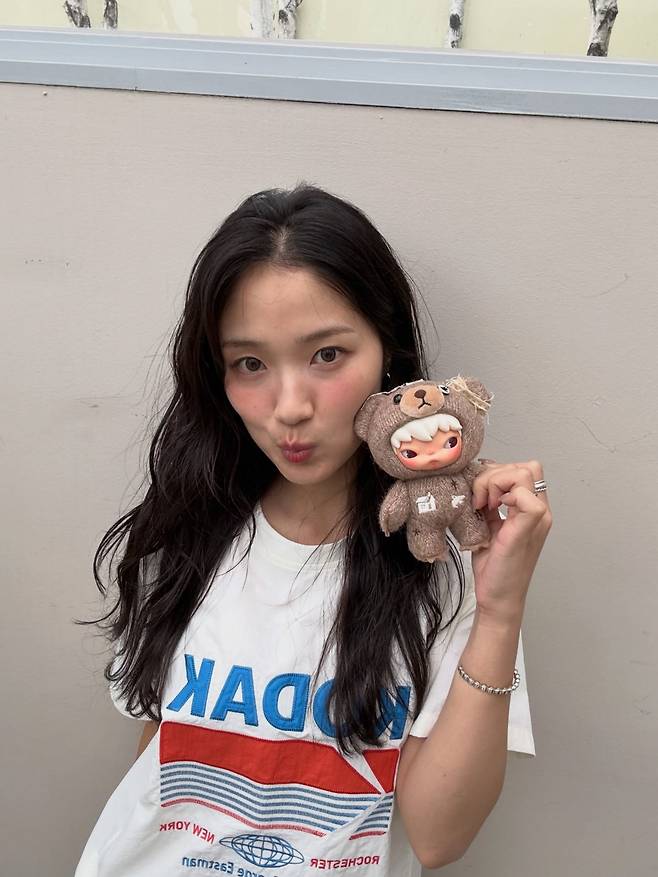 자연스럽게 내린 머리카락과 맑은 피부, 그리고 한 손에 든 귀여운 테디베어 인형은 김혜윤만의 전매특허인 '과즙 미소'를 더욱 극대화합니다.