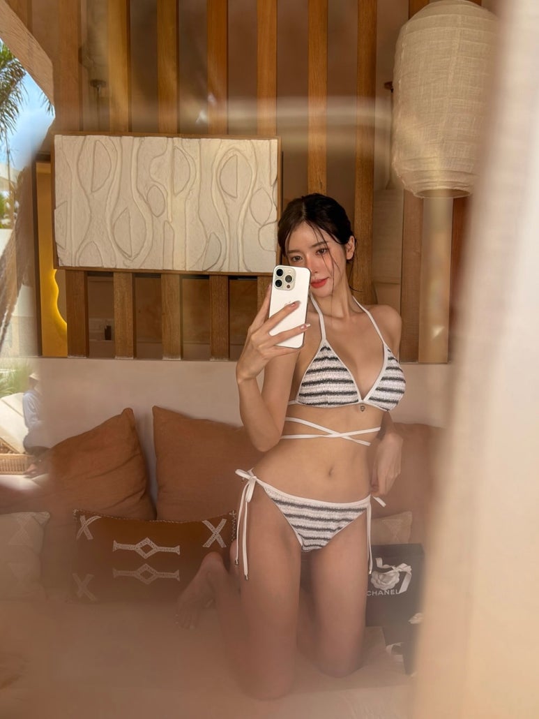 이번 은솔 님의 코디에서 가장 먼저 시선을 사로잡는 건 단연 블랙 & 화이트 스트라이프 비키니예요. 🦓