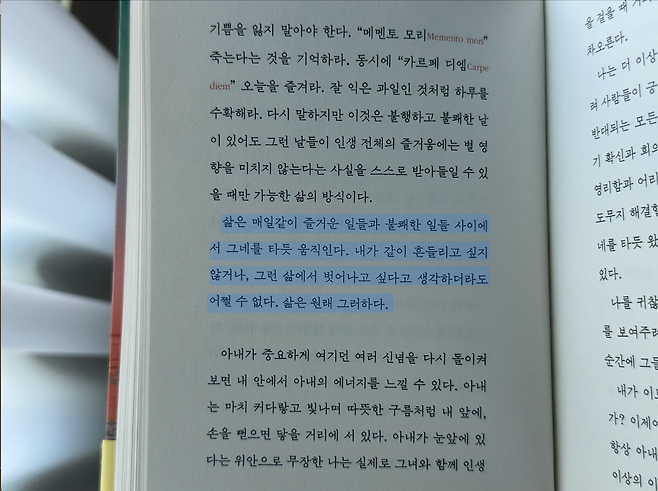 “삶은 매일같이 즐거운 일들과 불쾌한 일들 사이에서 그네를 타듯 움직인다. 내가 같이 흔들리고 싶지 않거나, 그런 삶에서 벗어나고 싶다고 생각하더라도 어쩔 수 없다. 삶은 원래 그러하다.”