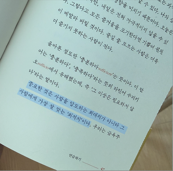 빌헬름 슈미트는 『삶으로 다시 날아오르기』에서 이렇게 말한다. “올바른 정도란 ‘충분하다는 뜻이다. 중요한 것은 사람을 압도하는 최대치가 아니라 그 사람에게 가장 잘 맞는 ‘최적치’이다.” 나에게 맞는 삶이 아니라, 남들이 말하는 기준에 맞추는 순간 불행은 시작된다.