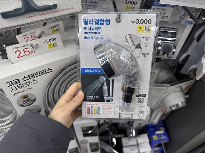 다이소 욕실 코너에서 가장 인기 많은 제품 중 하나입니다. 물줄기가 고르게 나오고 설치도 간단해 교체용으로 많이 사용합니다.