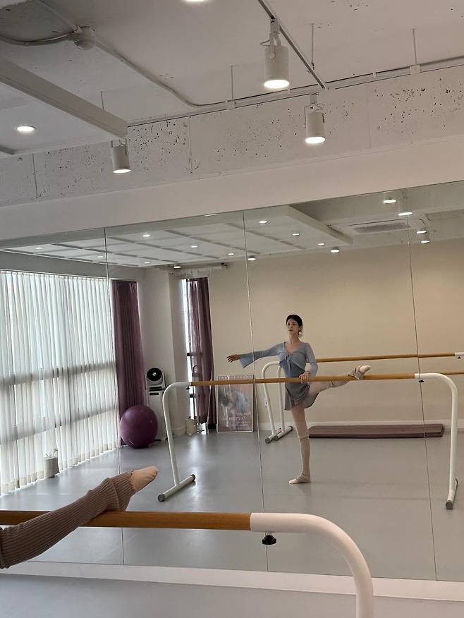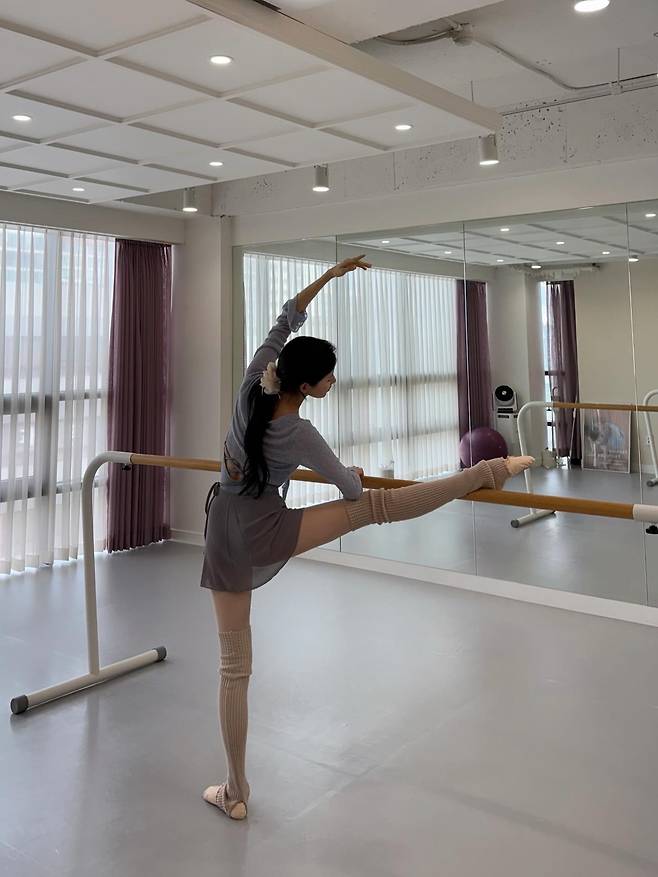 사진 속 서현은 은은한 소라색 레오타드에 시스루 소재의 랩 가디건을 매치하여 우아하면서도 전문적인 발레리나의 분위기를 자아냅니다.