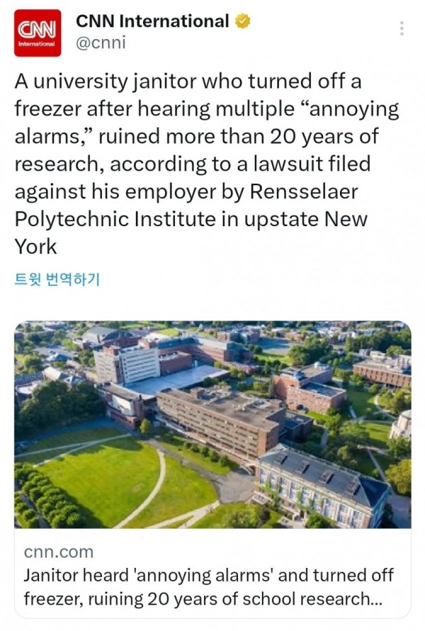 미국 뉴욕주의 렌셀러 폴리테크닉 대학교(RPI)에서 발생한 사건으로 청소원이 연구실 냉동고의 알람 소리를 끄려다 전원을 차단하여 20년 이상의 연구 성과를 한순간에 물거품으로 만든 사건