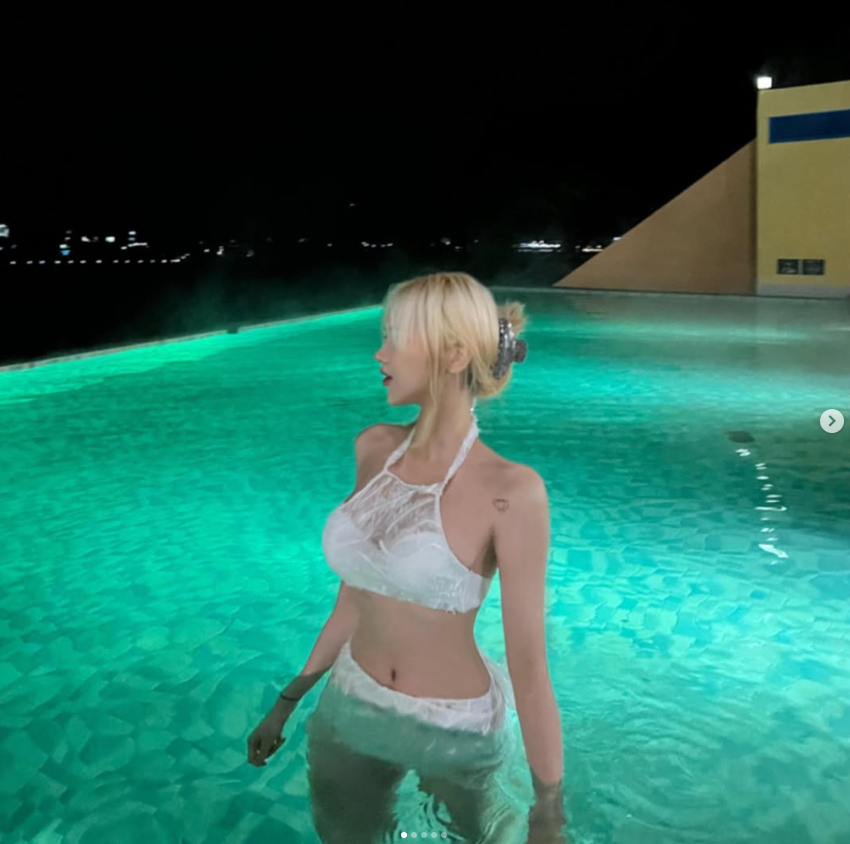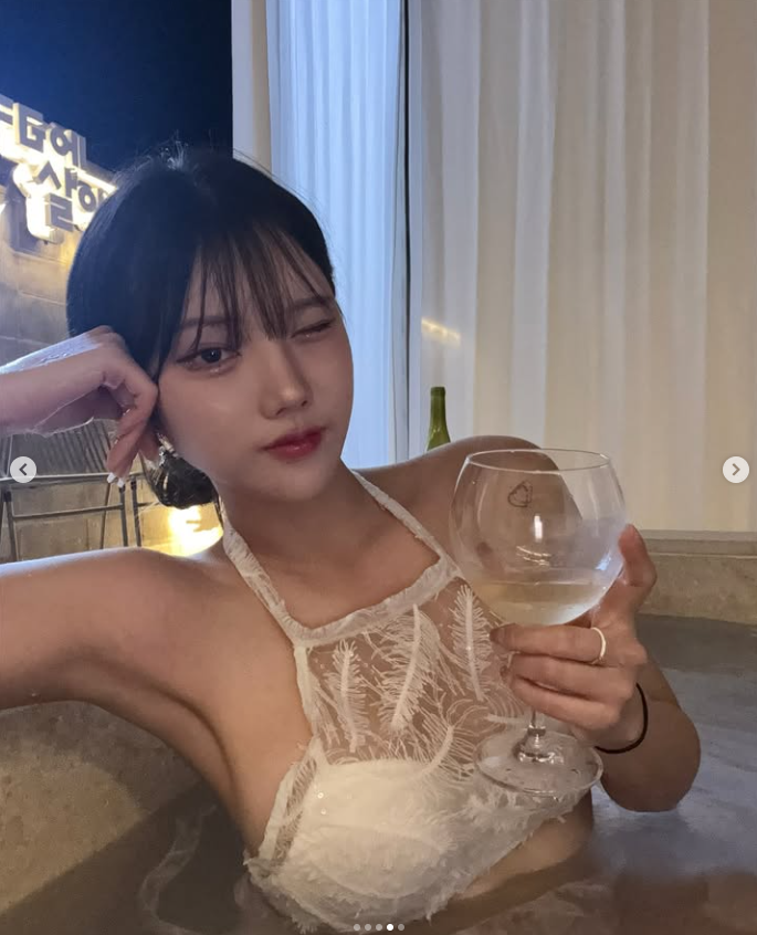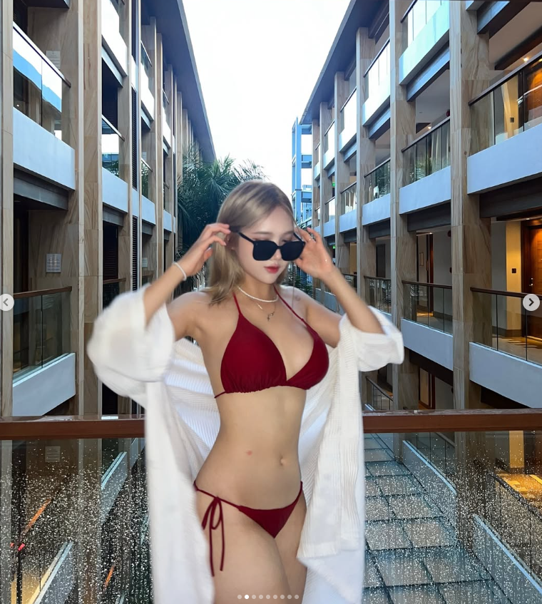 와인 한 잔을 곁들인 여유로운 연출은 수영복을 단순한 물놀이용 의상이 아닌, 하나의 '파티 룩'으로 격상시켰어요.
