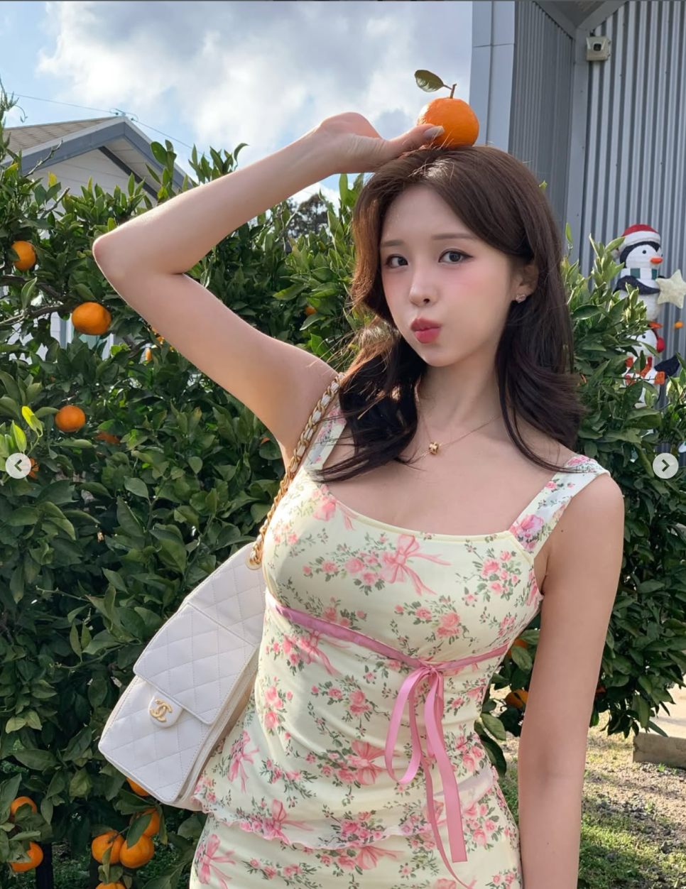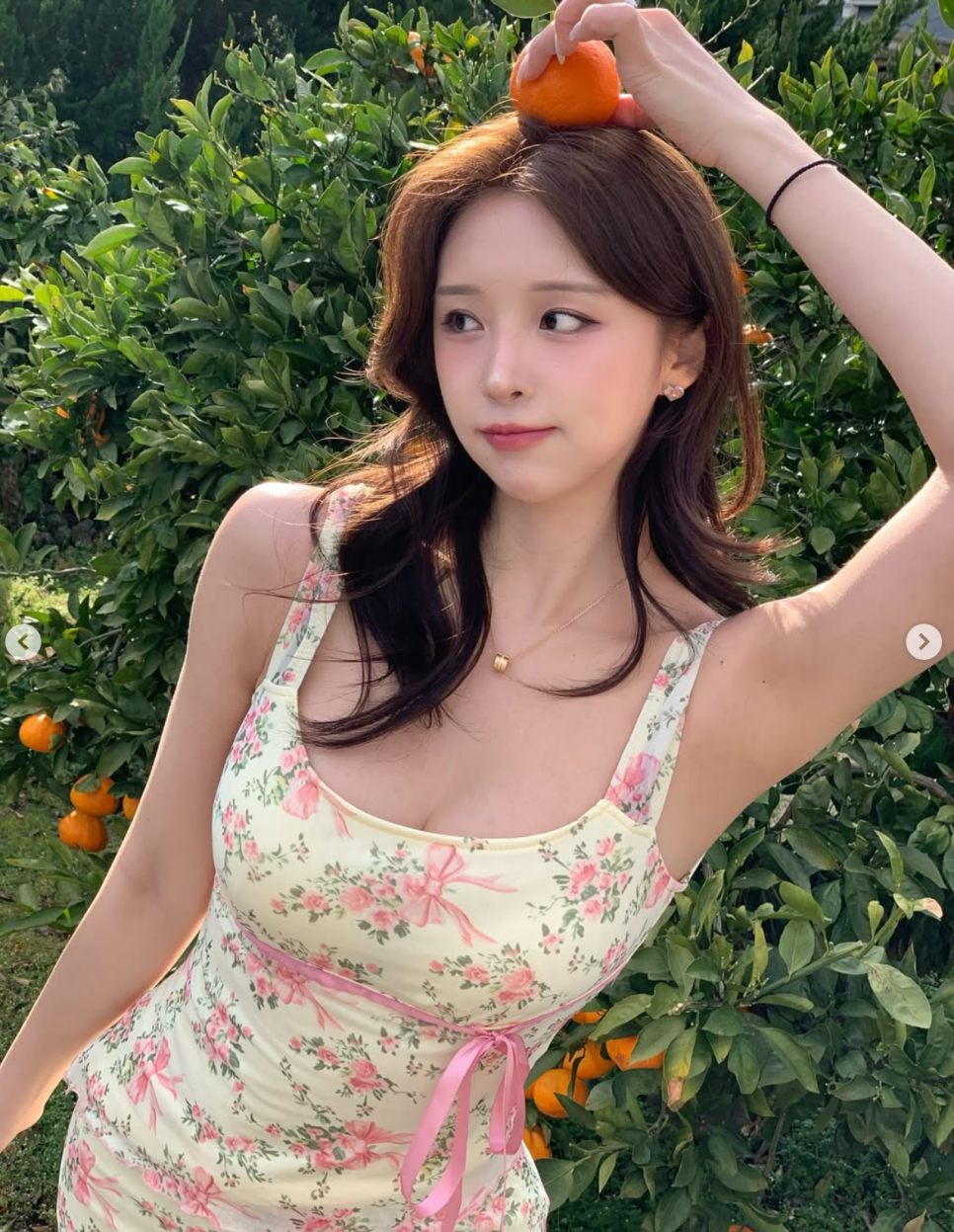 이번에 공개된 사진 속에서 가장 돋보이는 건 단연 배경과의 조화예요. 제주의 상징인 귤나무 아래에서 오렌지와 브라운 톤이 섞인 에스닉 패턴의 수영복을 선택했더라구요.