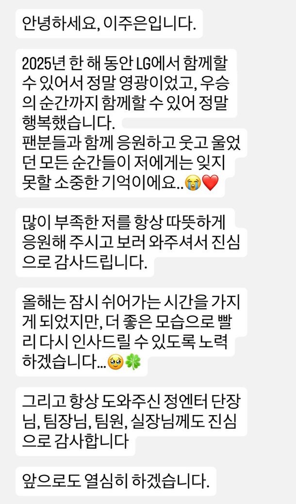 하지만 쉼 없이 달려온 승리 요정에게도 재충전의 시간이 필요했던 것 같습니다. 이주은 씨는 지난 21일 자신의 SNS를 통해 “2026년 시즌에는 잠시 쉬어가겠다”는 소식을 직접 전했습니다. 그녀는 "2025년 한 해 동안 LG에서 함께할 수 있어서 영광이었고, 우승의 순간까지 함께할 수 있어 행복했다"며 소속팀과 팬들에 대한 깊은 애정을 드러냈습니다.