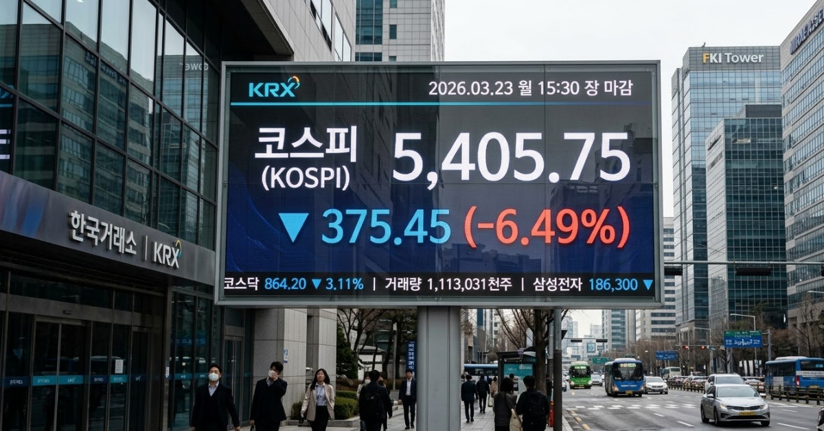 23일 코스피가 6.49% 급락하며 장을 마감했다. 전 거래일 대비 375.45 하락한 5405.75를 기록하며 하락세를 면치 못했다. 개인이 6조 9984억 원을 순매수하며 방어에 나섰으나 외국인과 기관이 각각 3조 6754억 원, 3조 8127억 원을 매도하며 시장 하락을 주도했다.