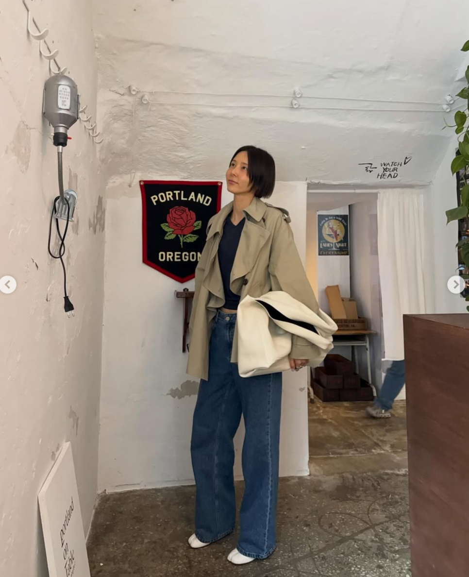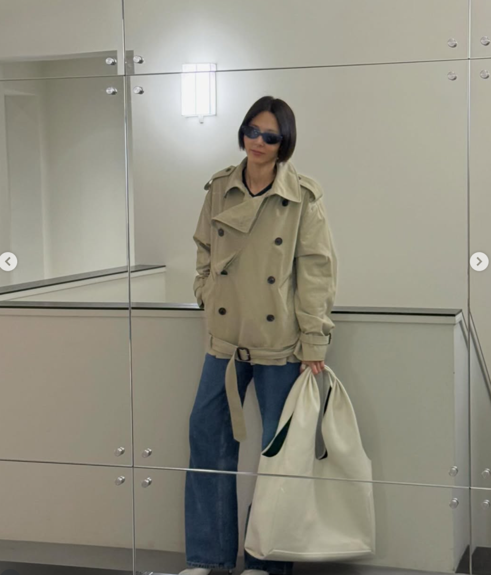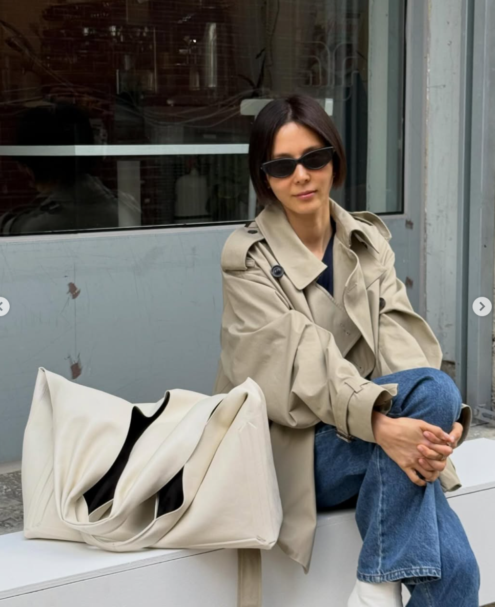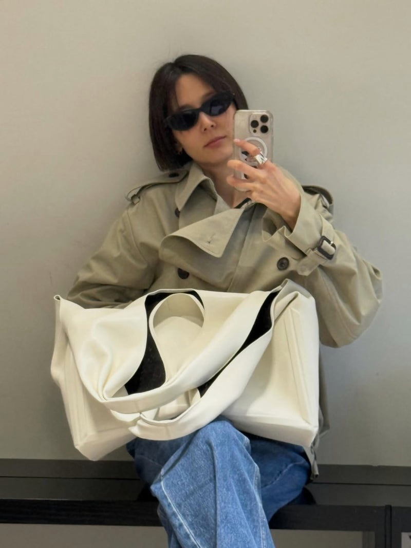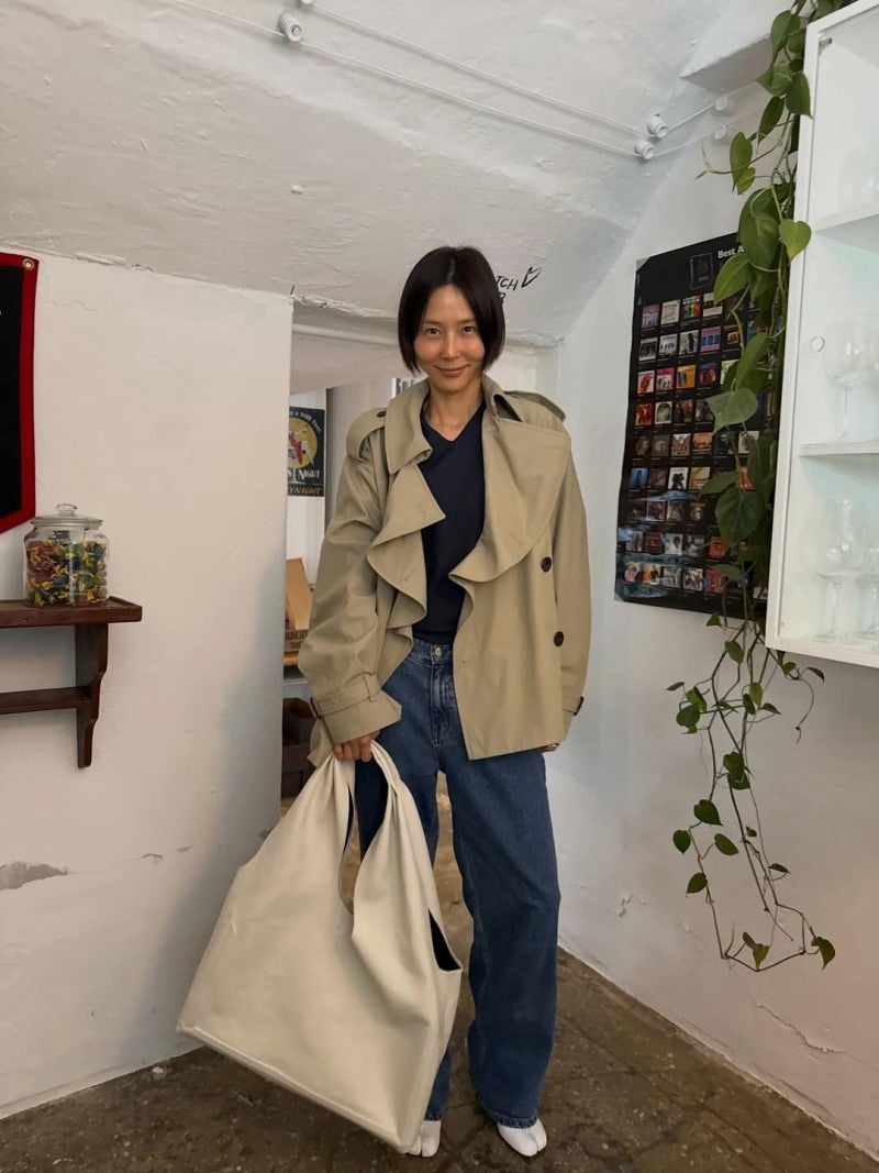 크롭 트렌치코트로 산뜻한 비율을 살려주고, 오버사이즈 박스백으로 무게감을 더해준 밸런스가 정말 훌륭하죠.