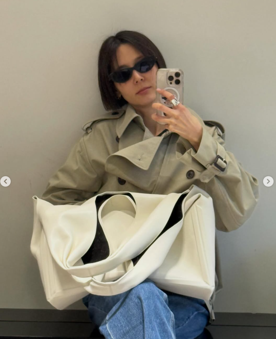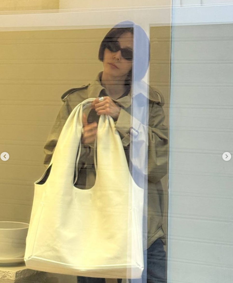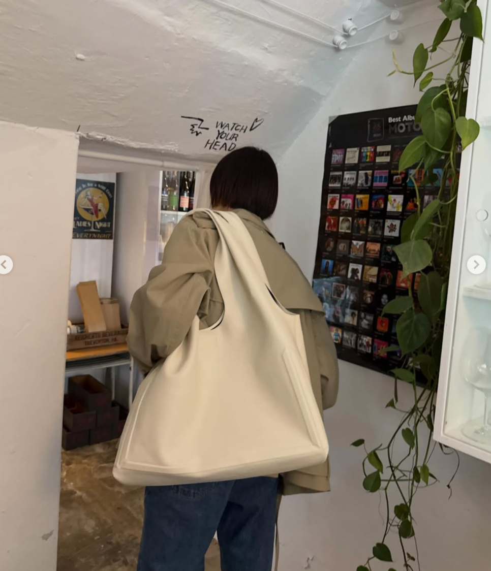 대신 가방의 압도적인 크기와 아우터의 구조적인 실루엣으로 포인트를 주어 지루함을 완벽하게 덜어냈습니다. 미니멀한 룩에 확실한 존재감을 더하는 방법, 정말 배울 점이 많죠.