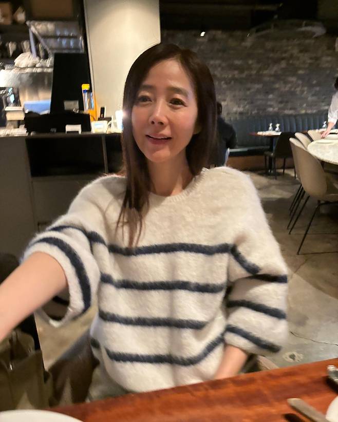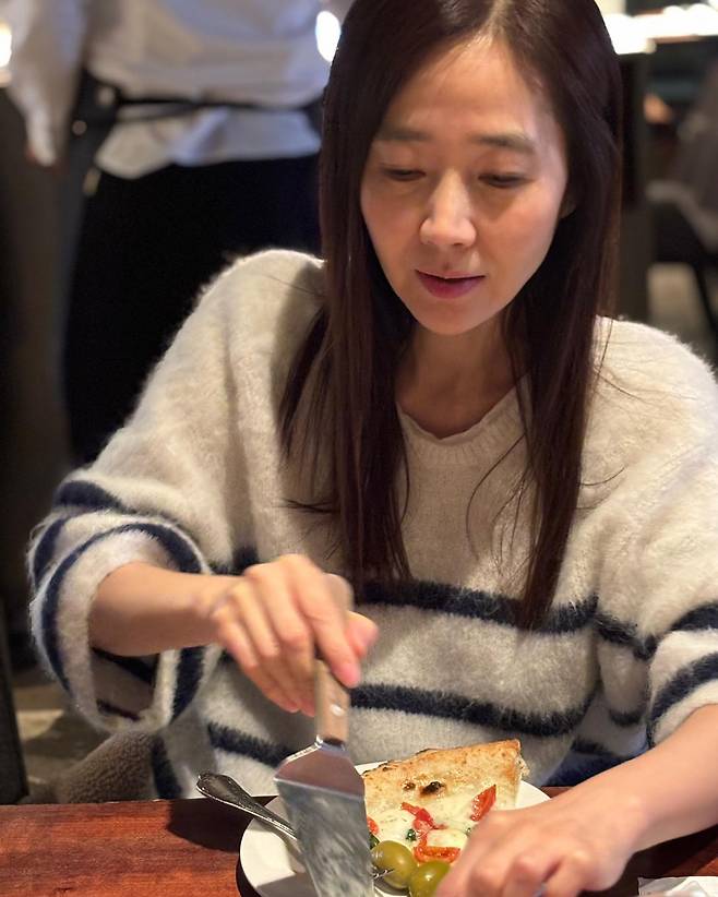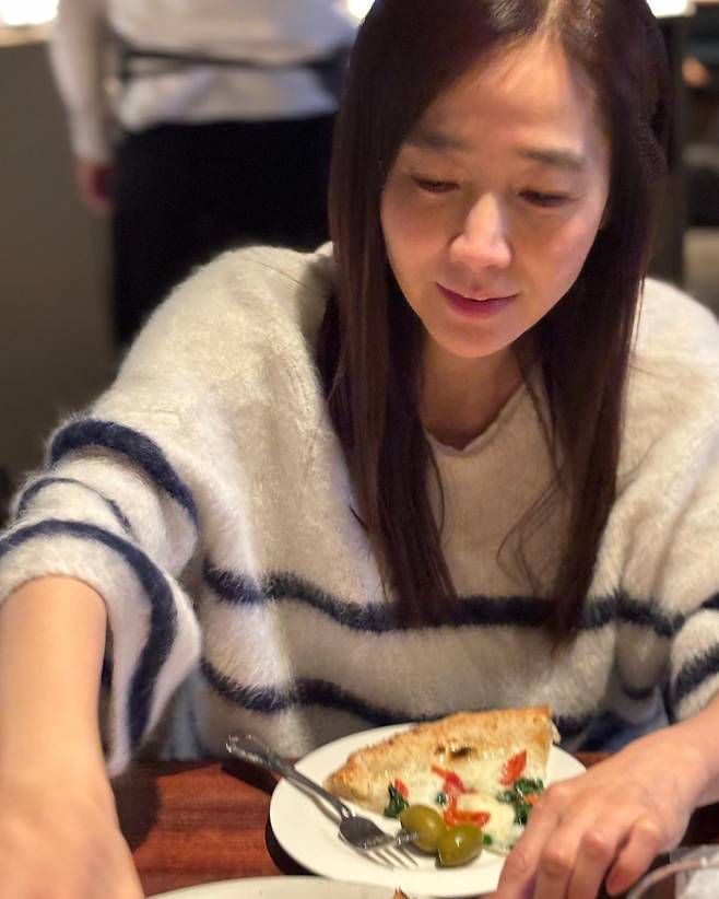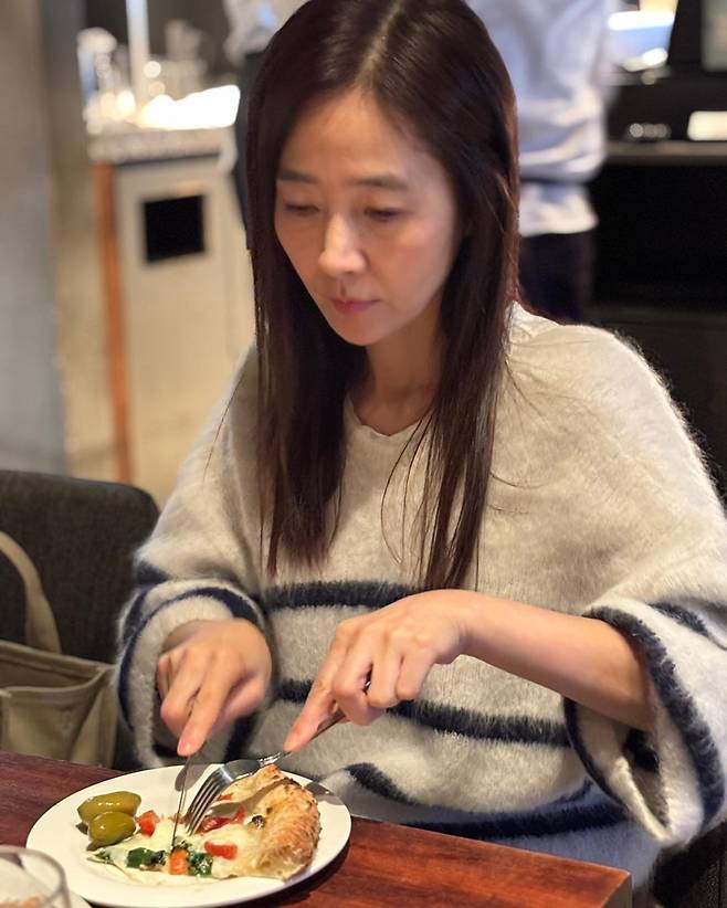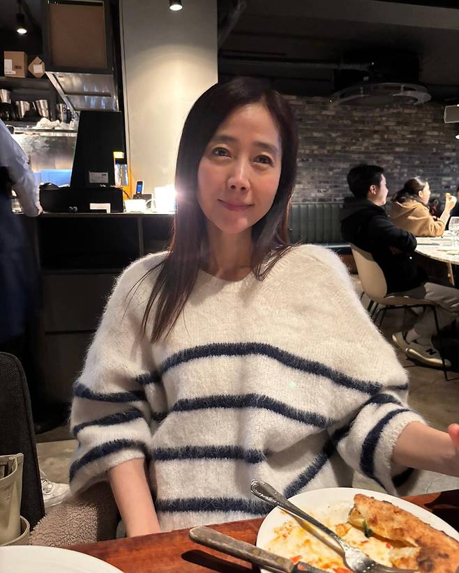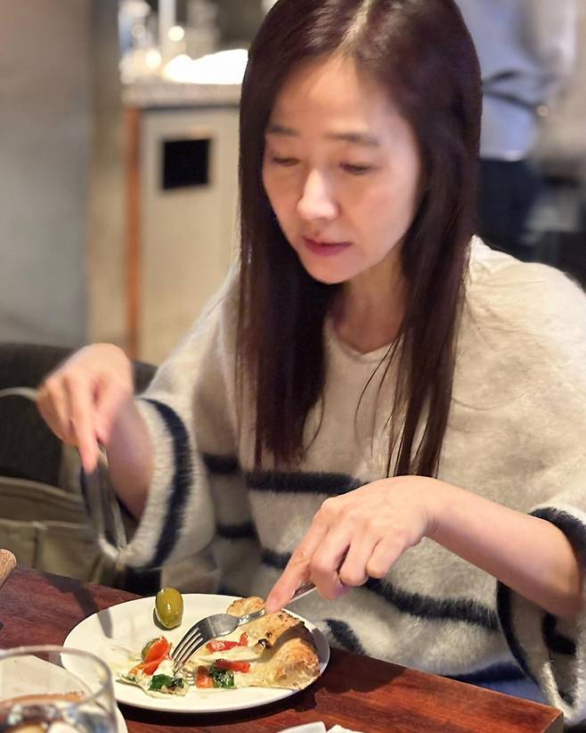 사진 속에서도 포근한 스트라이프 니트 차림으로 여유롭게 식사를 즐기는 그녀의 모습에서 건강한 에너지가 느껴집니다.
