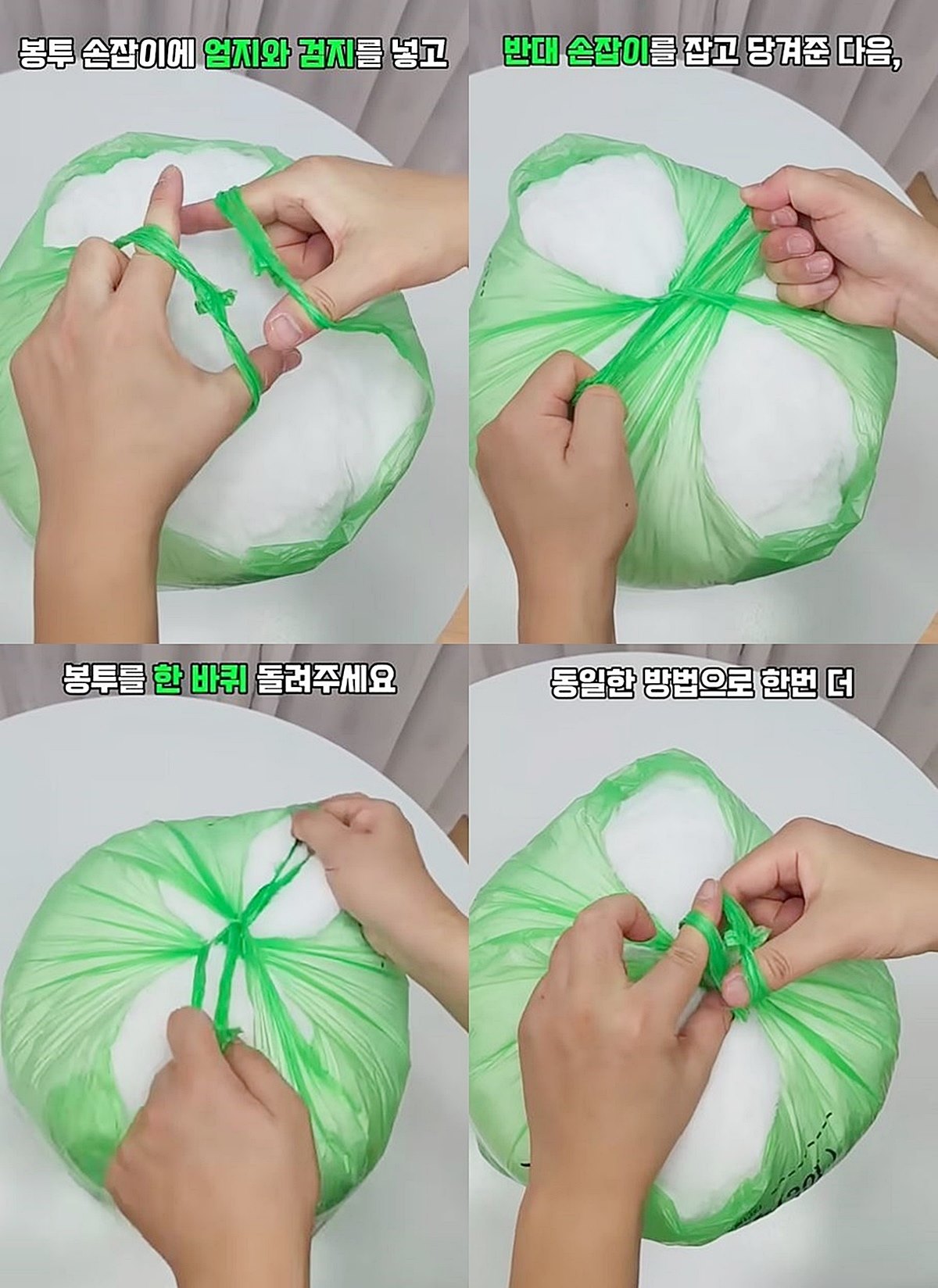 종량제봉투는 버리기 전 묶는 순간에 불편을 느끼기 쉬운 만큼, 손잡이에 엄지와 검지를 넣고 양손을 교차해 반대편 손잡이를 잡아당긴 뒤 봉투를 한 바퀴 돌리고 다시 같은 방식으로 한 번 더 교차해 묶는 요령을 알아 두면 일상에서 꽤 유용하게 활용할 수 있다.