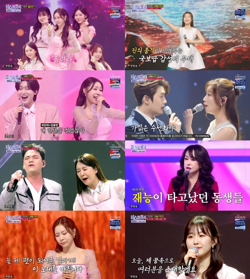 반가운 얼굴들도 있었다. ‘미스트롯4’의 영원한 맏언니 적우가 동생들을 위해 나선 것. 적우는 폭발적인 무대와 함께 “내게도 트롯 DNA가 있다”라는 말을 해 모두를 놀라게 했다. 트롯 여왕 김용임과 길려원의 폭발적인 성량이 돋보인 ‘천둥소리’ 무대도 현장을 발칵 뒤집었다. 무엇보다 딸을 위해 ‘미스트롯4’ OB부로 참가했던 김금희가 등장, 善이 된 딸 허찬미와 함께 부른 ‘사랑은 영원히’는 이 세상 많은 엄마와 딸들의 마음을 적시며 큰 감동을 안겼다.