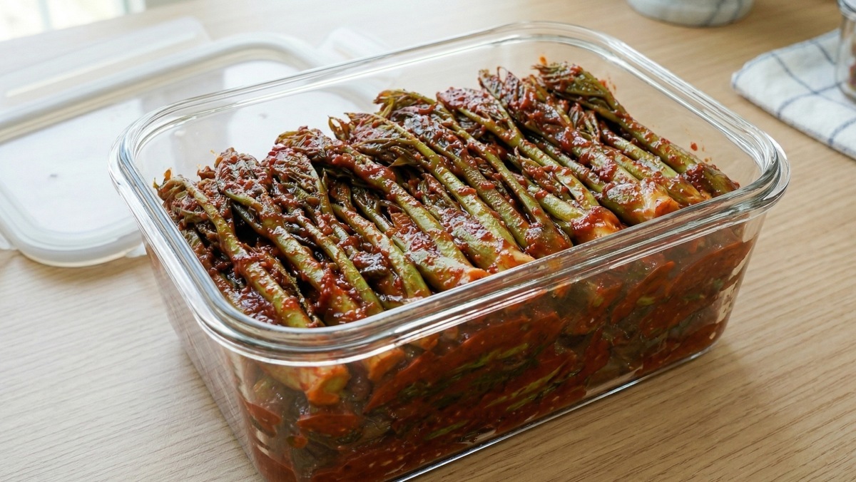 건조가 완료된 두릅은 준비한 양념에 넣어 골고루 무쳐준다. 이때 양념이 전체에 고르게 배도록 충분히 버무리는 것이 중요하다. 완성된 두릅 장아찌는 용기에 담은 뒤, 남은 고추장을 위에 덮어 공기와의 접촉을 줄여준다. 마지막으로 소금을 살짝 위에 뿌려주면 보관 기간을 더욱 늘릴 수 있다고 한다.