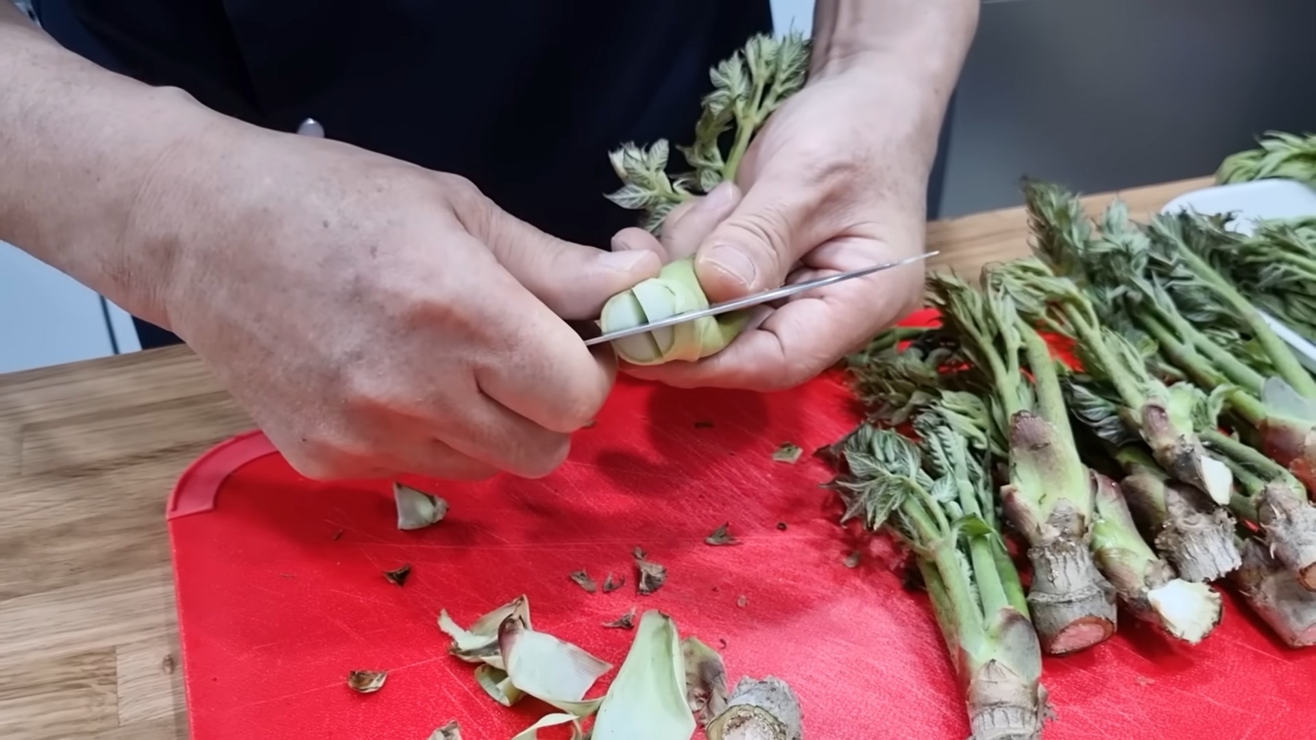 두릅 장아찌를 만들기 위해서는 손질 과정이 중요하다. 두릅의 밑동을 잘라낸 뒤 겉껍질을 벗겨주면 부드럽게 먹을 수 있다. 십자 모양으로 두릅 밑동에 칼집을 내주면 양념이 잘 배고 식감도 좋아진다. 특히 질긴 껍질은 제거해 주는 것이 완성도를 높이는 포인트다.