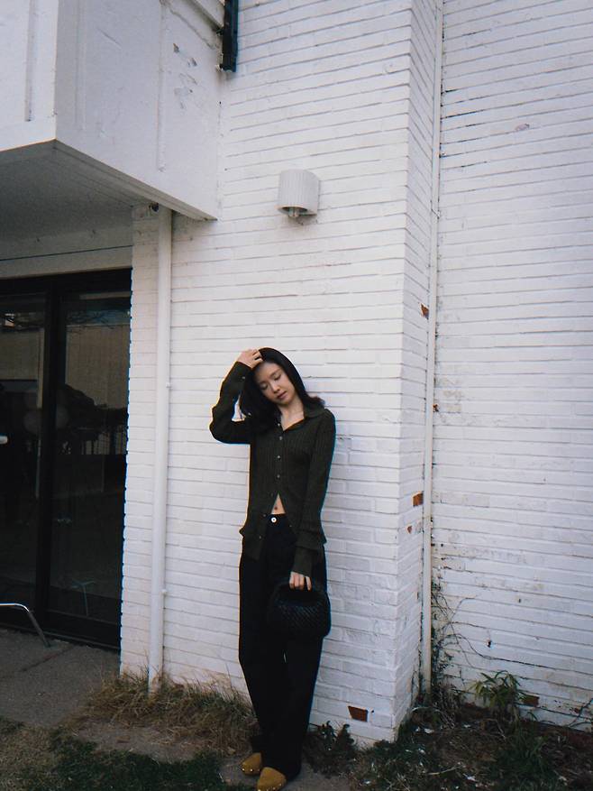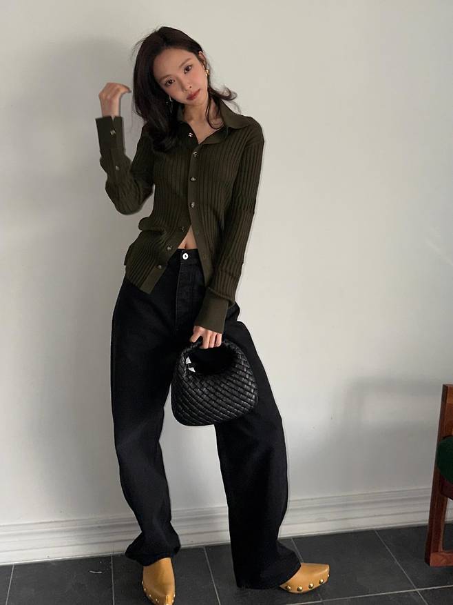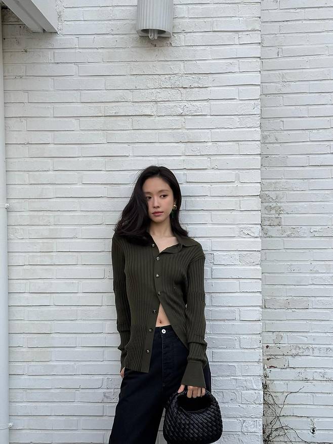 손나은은 이번 착장에서 시크한 다크 카키 무드에 감각적인 포인트 디테일을 더해 군더더기 없는 세련된 스타일을 완성했습니다.