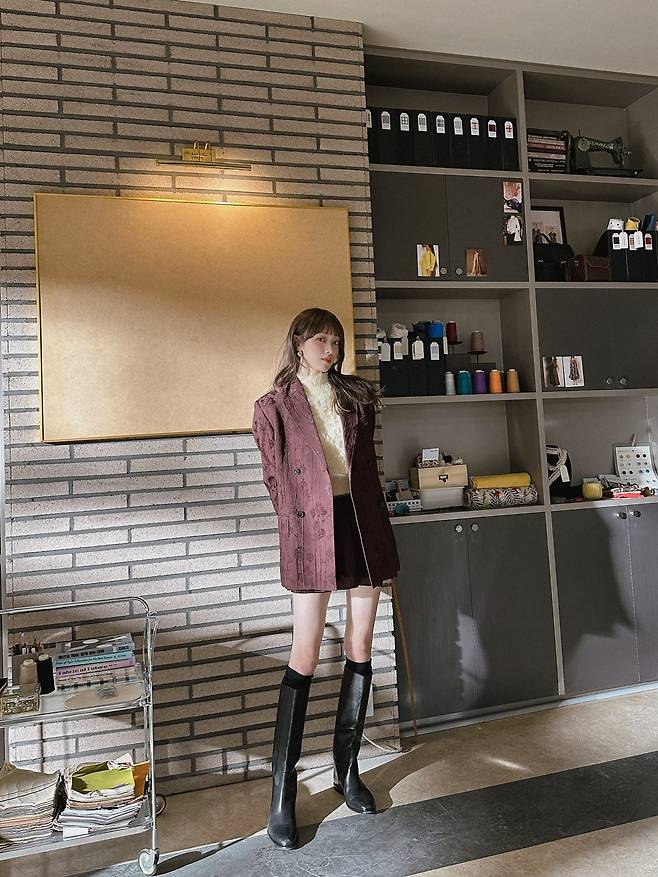 짧은 하의를 선택해 우월한 각선미를 강조하면서도, 무릎까지 올라오는 깔끔한 라인의 블랙 가죽 롱부츠를 더해 전체적인 스타일의 균형을 잡았습니다.
