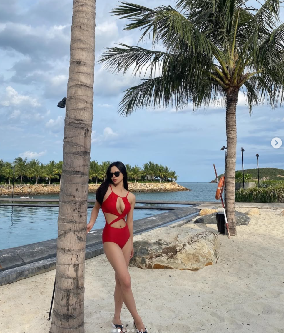 화려한 수영복 디자인에 맞춰 헤어는 차분하게 긴 생머리로 연출한 게 신의 한 수 같아요. 레드 컬러가 주는 화사함 덕분에 얼굴에 형광등을 켠 것처럼 피부 톤이 맑아 보이네요.